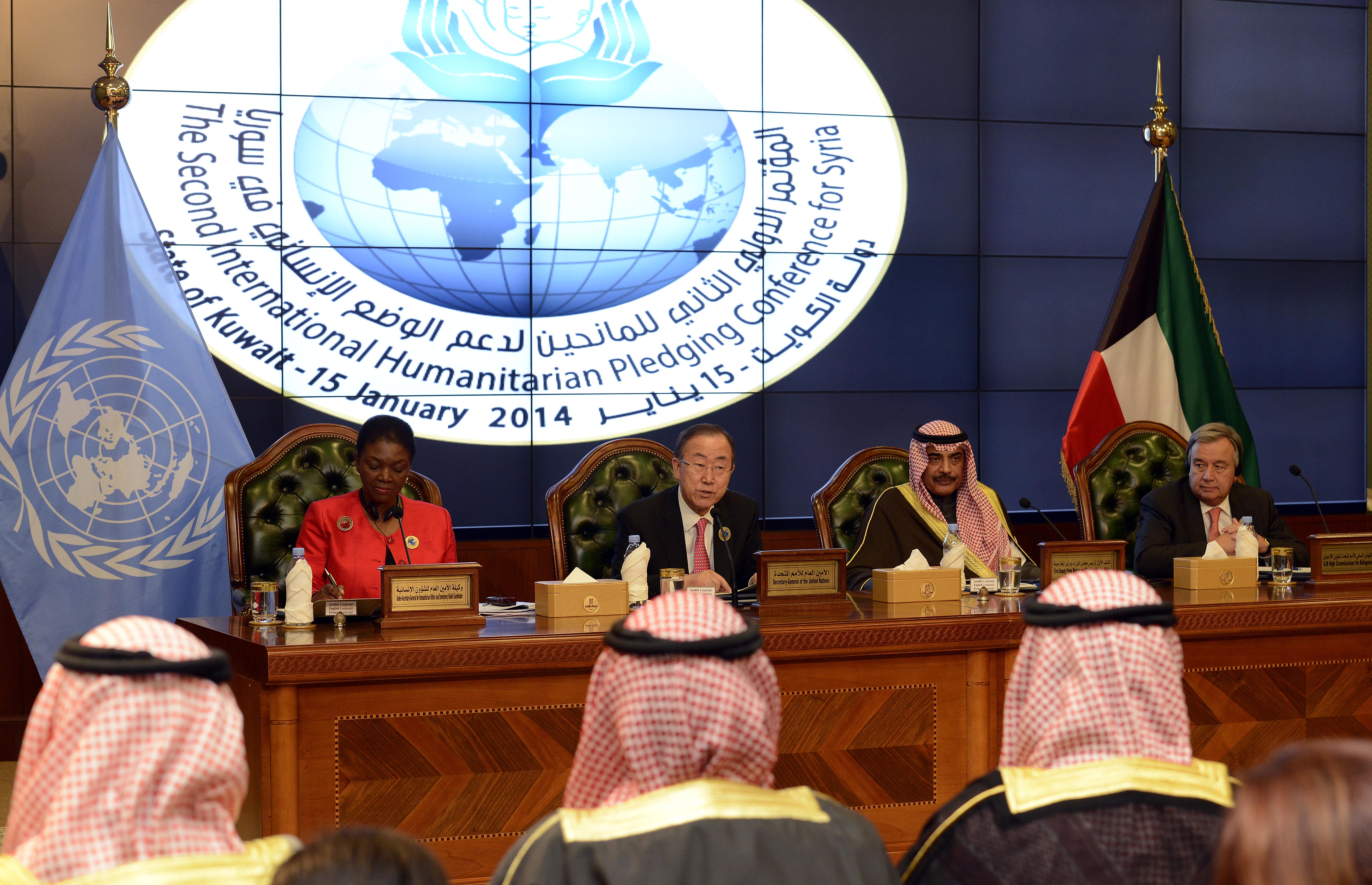 وأعرب بان كي مون في مؤتمر صحافي مشترك مع النائب الاول لرئيس مجلس الوزراء ووزير الخارجية الشيخ صباح خالد الحمد الصباح في ختام المؤتمر هنا اليوم عن الشكر لسمو أمير الكويت الشيخ صباح الاحمد الجابر الصباح "على اظهاره شجاعة كبيرة من خلال مساهمته القيادية ب 500 مليون دولار" اضافة الى الدول والمنظمات الدولية والوكالات الانسانية "فحضورها اليوم يظهر روحا حقيقية من المواطنة العالمية".