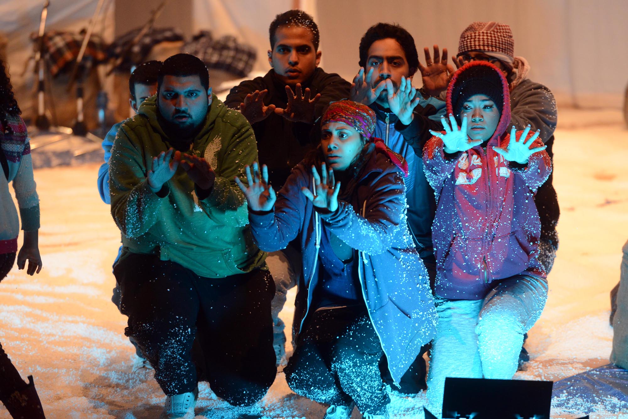 وقدم العرض على هامش استضافة الكويت للمؤتمر الدولي الثالث للمانحين لدعم الوضع الانساني في سوريا الذي سيبدأ اعماله غدا اذ رسم من خلال أداء حركي وغنائي وموسيقي ملامح الواقع الصعب والمرير الذي يواجهه اللاجئين تحت وطأة الظروف المناخية القاسية وقلة الحيلة.
