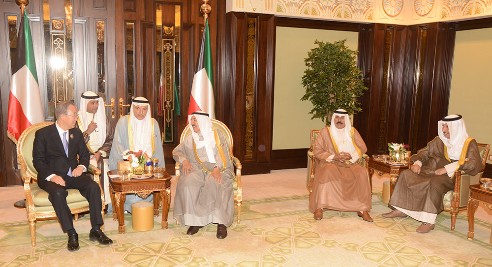 حضرة صاحب السمو امير البلاد الشيخ صباح الاحمد الجابر الصباح حفظه الله ورعاه مستقبلا معالي الامين العام للامم المتحدة بان كي مون