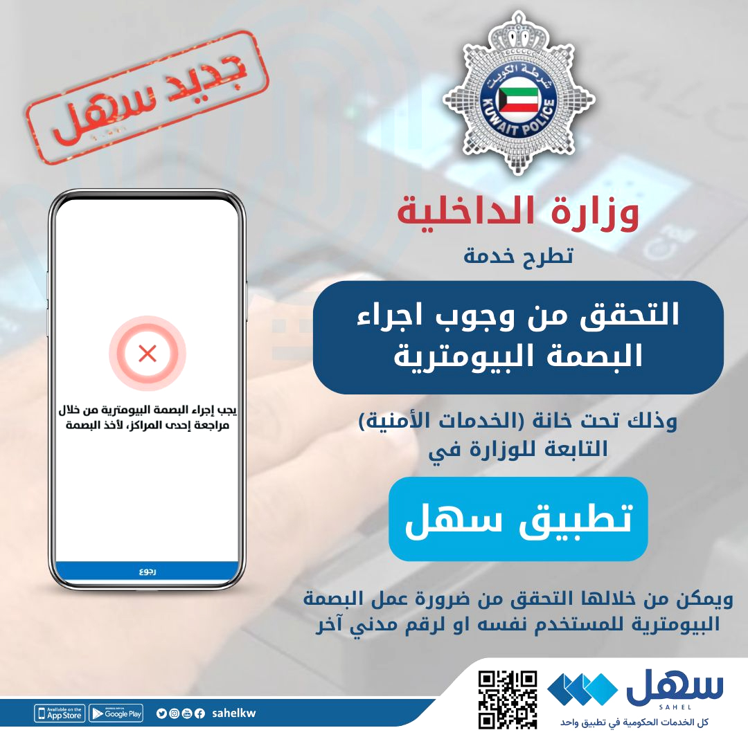 الكويت - 28 - 3 (كونا) -- أعلن المتحدث الرسمي باسم التطبيق الحكومي الموحد للخدمات الالكترونية (سهل) يوسف كاظم عن قيام وزارة الداخلية بطرح خدمة إلكترونية جديدة عبر تطبيق (سهل) تتمثل في (التحقق من وجوب اجراء البصمة البيومترية) وذلك تحت خانة (الخدمات الأمنية) للوزارة داخل التطبيق.