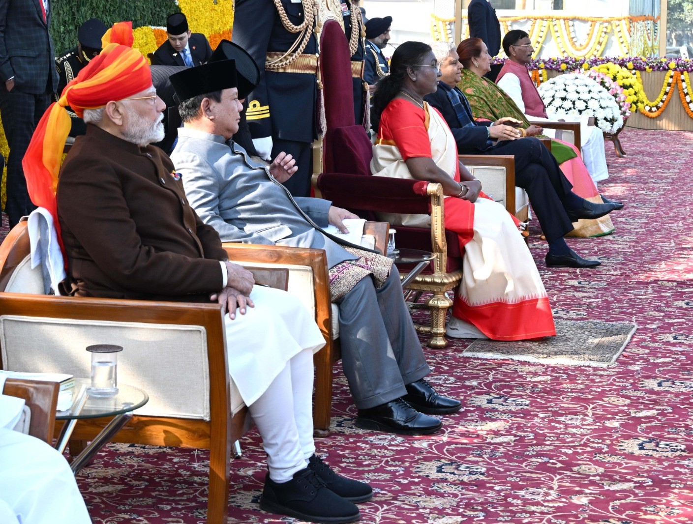 وبعد ذلك شرع رئيس الوزراء في تحية رئيس الهند دروبادي مورمو وضيف شرف الاحتفالات الرئيس سوبيانتو ثم مراسم رفع العلم الهندي وعزف النشيد الوطني وسط إطلاق طلقات نارية.