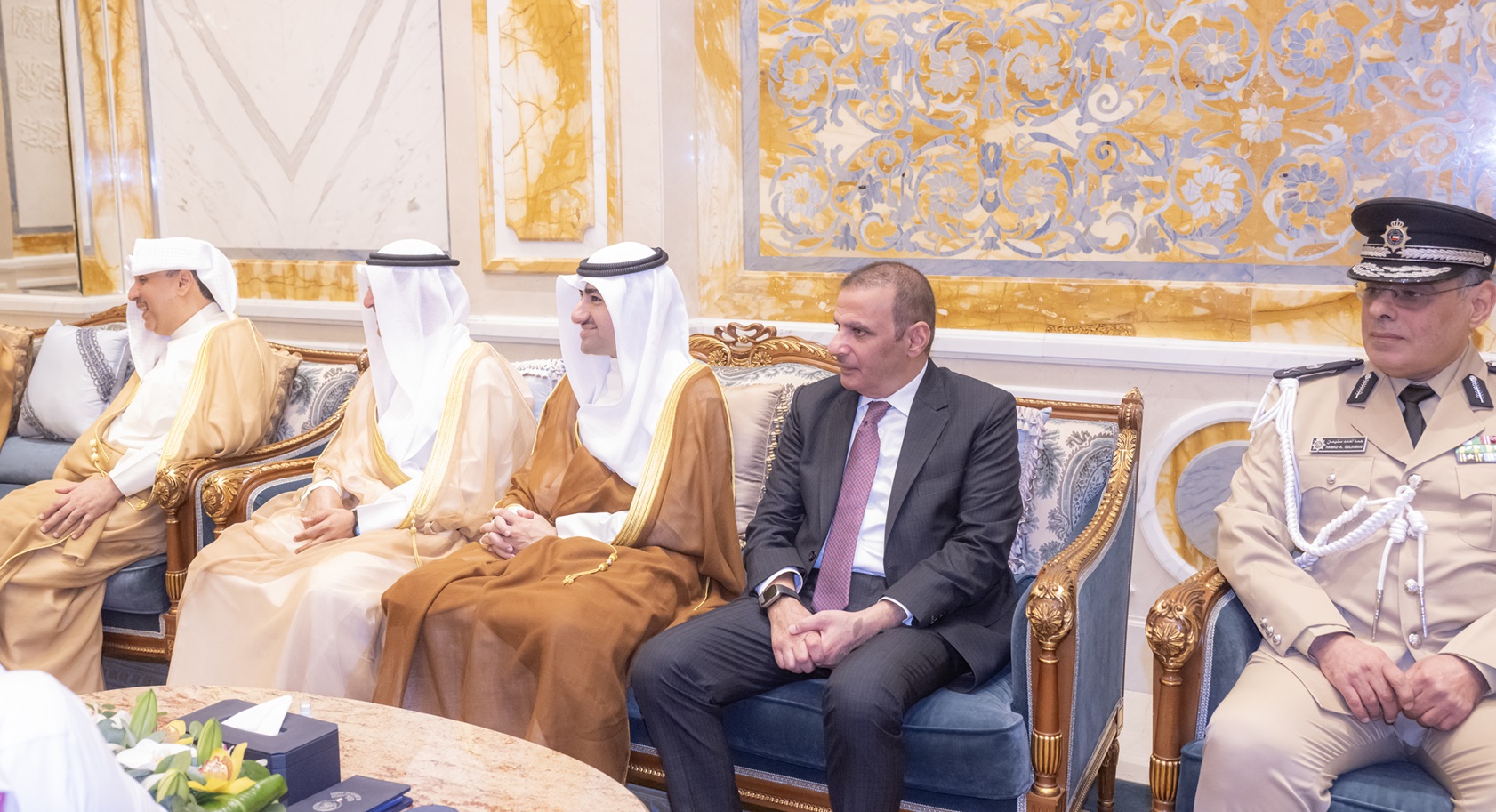 حضرة صاحب السمو أمير البلاد الشيخ مشعل الأحمد الجابر الصباح مستقبلا وزير الداخلية السعودي صاحب السمو الملكي الأمير عبدالعزيز بن سعود بن نايف بن عبدالعزيز آل سعود