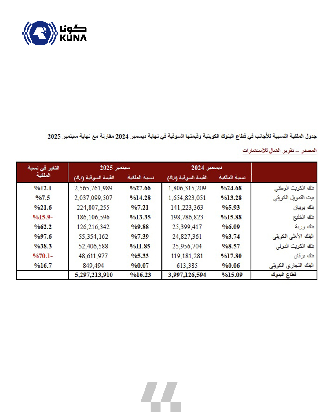 وأوضح تقرير (الشال) للاستشارات أن مؤشر قطاع البنوك ارتفع ما بين نهاية عام 2024 ونهاية سبتمبر الماضي بنحو 9ر20 في المئة كما ارتفعت مساهمة الأجانب النسبية فيه حيث تشير المعلومات المتوفرة حول الاستثمار الأجنبي في قطاع المصارف حتى نهاية سبتمبر الماضي إلى أن القيمة المطلقة لاستثمارات الأجانب بالقطاع ارتفعت إلى نحو 2ر5 مليار دينار كويتي (نحو 8ر15 مليار دولار أمريكي) مقارنة بنحو 9ر3 مليار دينار (نحو 8ر11 مليار دولار) في نهاية عام 2024.