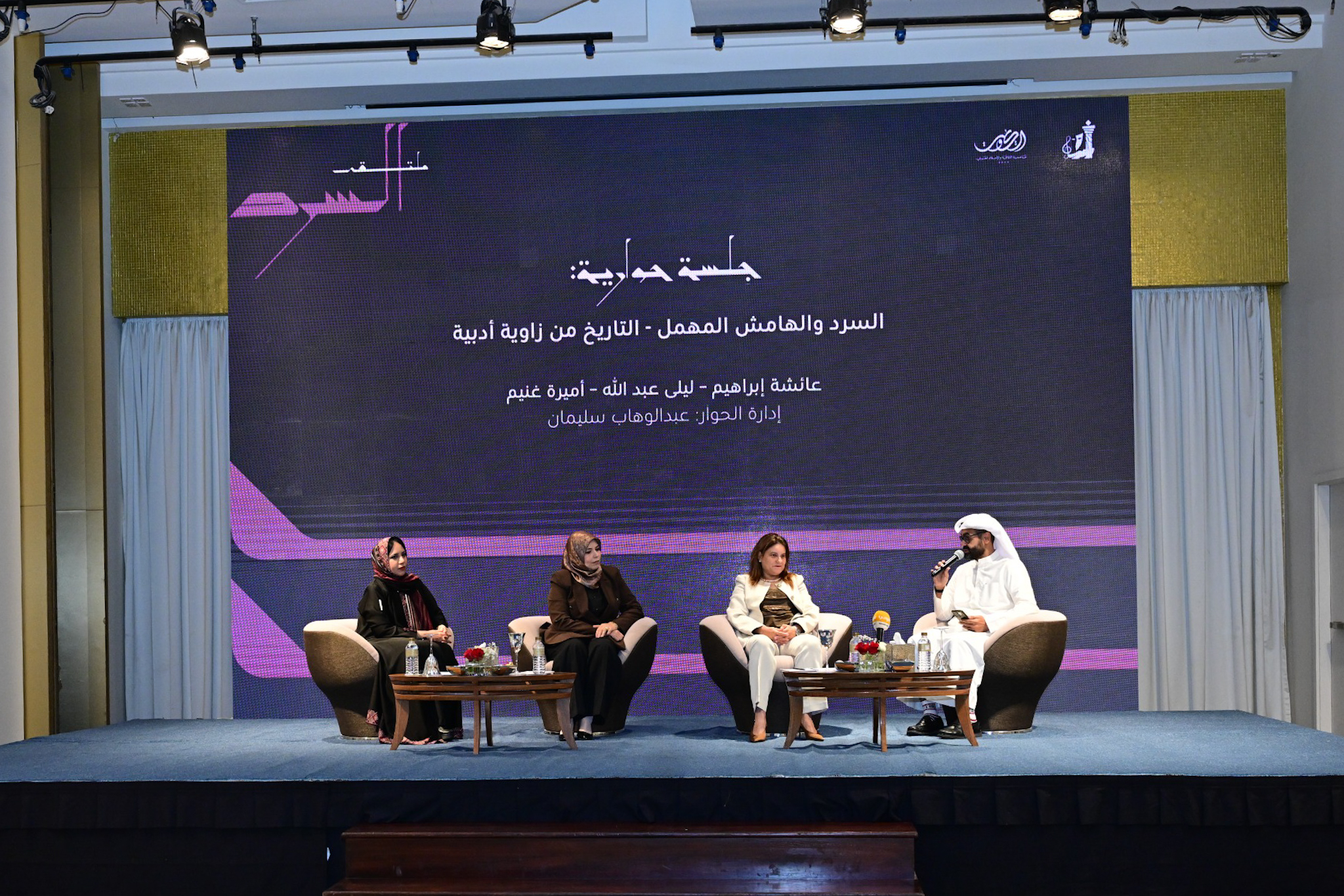 وأدار الجلسة الحوارية المعنونة (السرد والهامش المهمل - التاريخ من زاوية أدبية) الكاتب والمترجم الكويتي عبدالوهاب سليمان وشاركت فيها الدكتورة عائشة إبراهيم وهي روائية وقاصة من ليبيا والكاتبة العمانية ليلى عبدالله والأكاديمية الدكتورة أميرة غنيم من تونس.