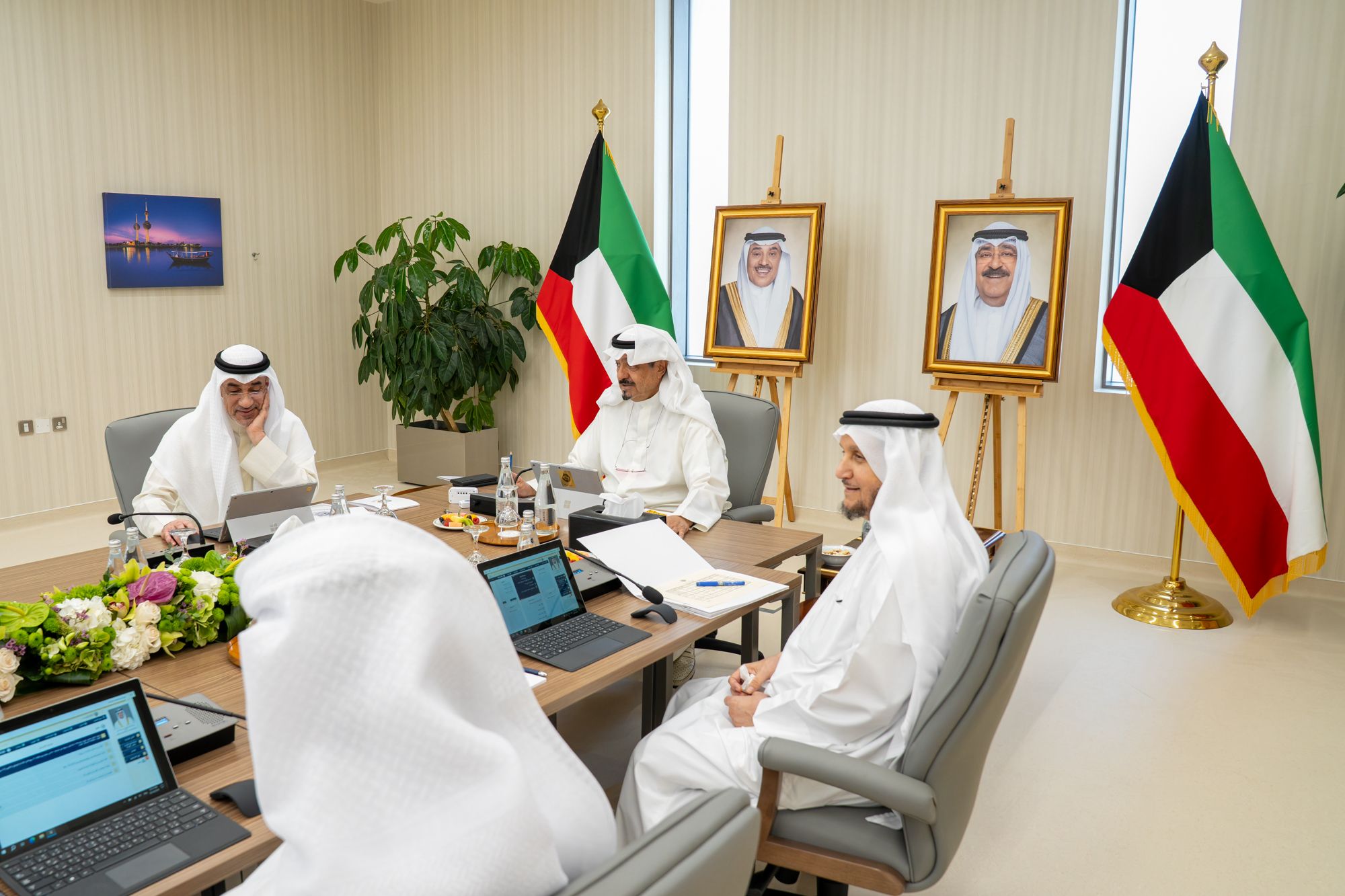 أحيط مجلس الوزراء علما في مستهل اجتماعه بتشكيل الوفد الرسمي المرافق لحضرة صاحب السمو أمير البلاد الشيخ مشعل الأحمد الجابر الصباح حفظه الله ورعاه خلال زيارته الأخوية إلى سلطنة عمان الشقيقة اليوم الثلاثاء والذي يضم كلا من معالي وزير الدفاع الشيخ عبدالله علي عبدالله السالم الصباح ومعالي مدير عام هيئة تشجيع الاستثمار المباشر الشيخ الدكتور مشعل جابر الأحمد الصباح وسعادة مدير مكتب حضرة صاحب السمو الأمير الفريق متقاعد جمال محمد الذياب ونائب رئيس مجلس الإدارة الرئيس التنفيذي لمؤسسة البترول الكويتية الشيخ نواف سعود الناصر الصباح والعضو المنتدب للهيئة العامة للاستثمار الشيخ سعود سالم عبدالعزيز الصباح سائلا المولى عز وجل أن يحيط حضرة صاحب السمو أمير البلاد الشيخ مشعل الأحمد الجابر الصباح حفظه الله ورعاه والوفد المرافق لسموه بكريم عنايته ورعايته في حله وترحاله.
