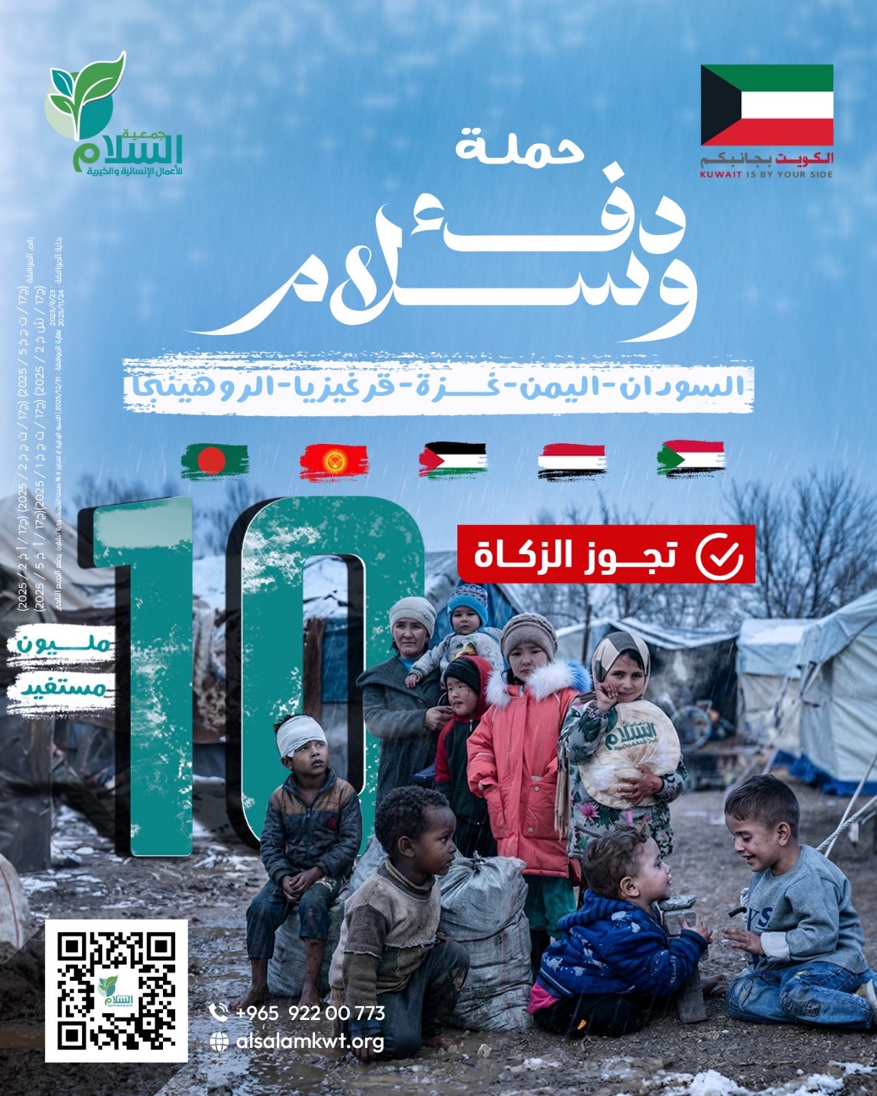 الكويت - 5 - 12 (كونا) -— أطلقت جمعية السلام للأعمال الإنسانية والخيرية اليوم الجمعة حملتها الشتوية تحت شعار (دفء وسلام) والتي تمتد حتى 31 يناير المقبل لدعم المتضررين والمحتاجين في السودان واليمن وقطاع غزة وقرغيزيا والروهينجا.