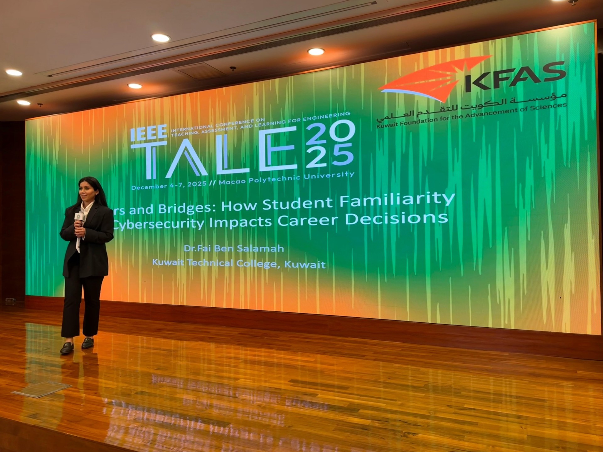 وعقد المؤتمر الذي استضافته جامعة ماكاو للفنون التطبيقية بمشاركة أكثر من 100 باحث وخبير من الجامعة العالمية ومن بينهم الدكتورة في بن سلامة من كلية الكويت التقنية التي قدمت اليوم نتائج دراستها بعنوان "المعوقات والحلول الممكنة لزيادة عدد المتخصصين في مجال الأمن السيبراني" وذلك ضمن مشروع بحثي برعاية مؤسسة الكويت للتقدم العلمي.