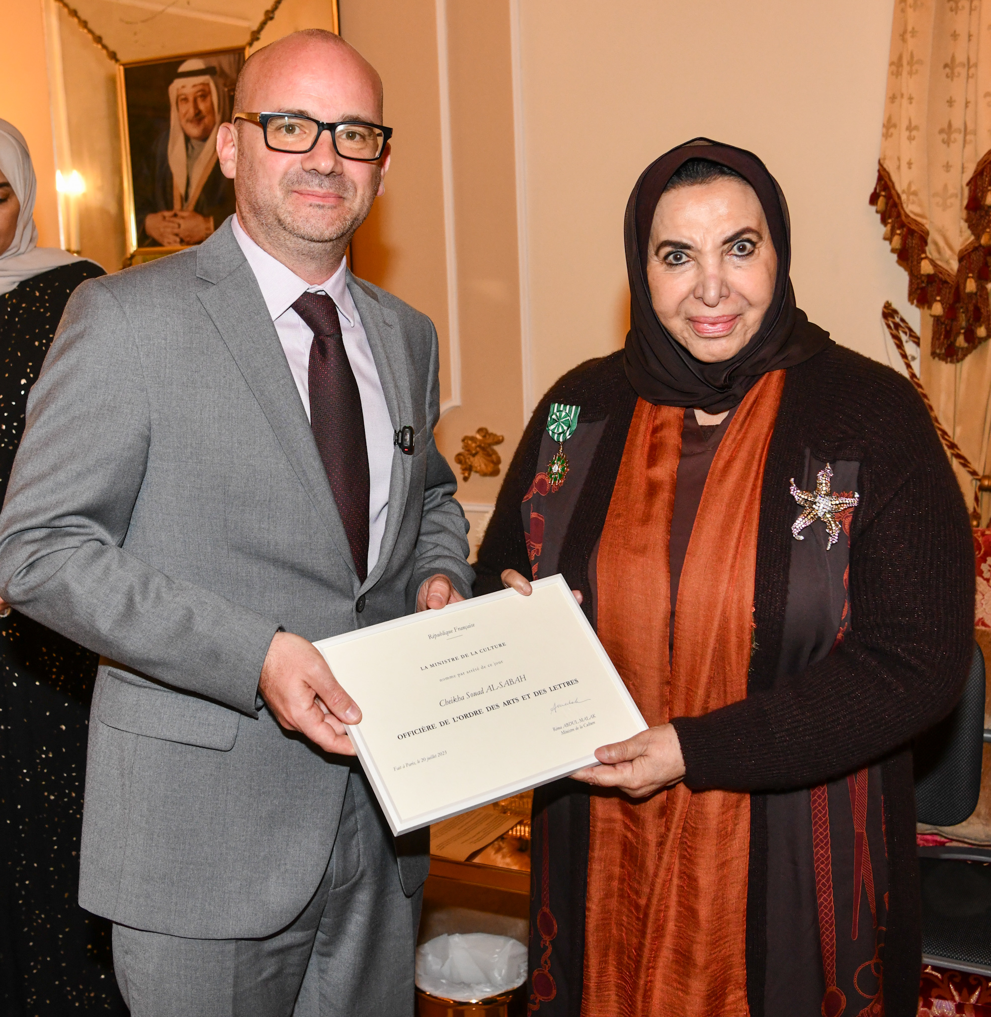 ولفت إلى أن "هذا التكريم يوفر فرصة لبناء مزيد من الشراكات بين البلدين بالتعاون مع الدكتورة الشيخة سعاد الصباح كما يبعث برسالة إيجابية إلى جميع الكويتيين المهتمين باللغة الفرنسية والأدب والعلوم مفادها أن فرنسا حريصة على توسيع مجالات التعاون والصداقة مع الشخصيات الثقافية والفكرية الفاعلة في دولة الكويت".