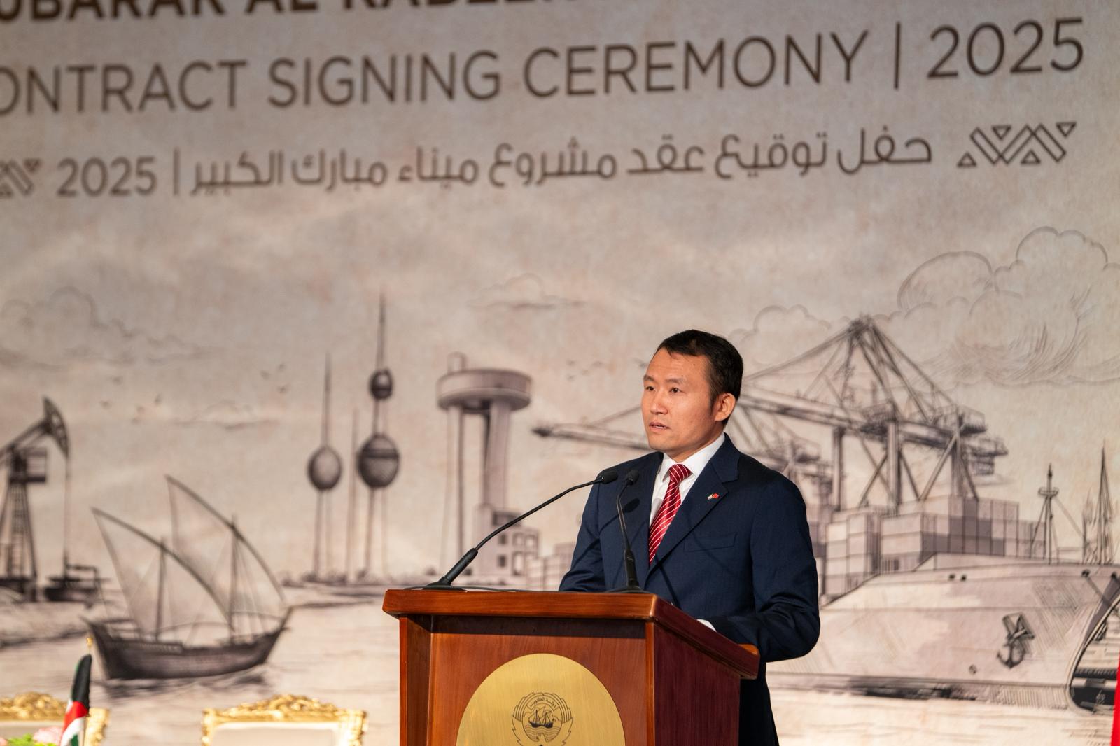 بدوره أعرب نائب رئيس شركة الصين للاتصالات والإنشاءات المحدودة تشن تشونغ في كلمة مماثلة عن شكره الجزيل وعظيم الامتنان لحكومة دولة الكويت على ثقتها الراسخة ودعمها الثابت على مر السنين مبينا أن عقد الهندسة والتوريد والبناء لمشروع ميناء مبارك الكبير يعد أول انجاز محوري في تنفيد الاستراتيجية المشتركة التي وضعها قيادتا البلدين متعهدا بإدارة المشروع بدقة عالمية والالتزام بأشد المعايير الدولية صرامة وتنفيذ أعماله بعناية متناهية.