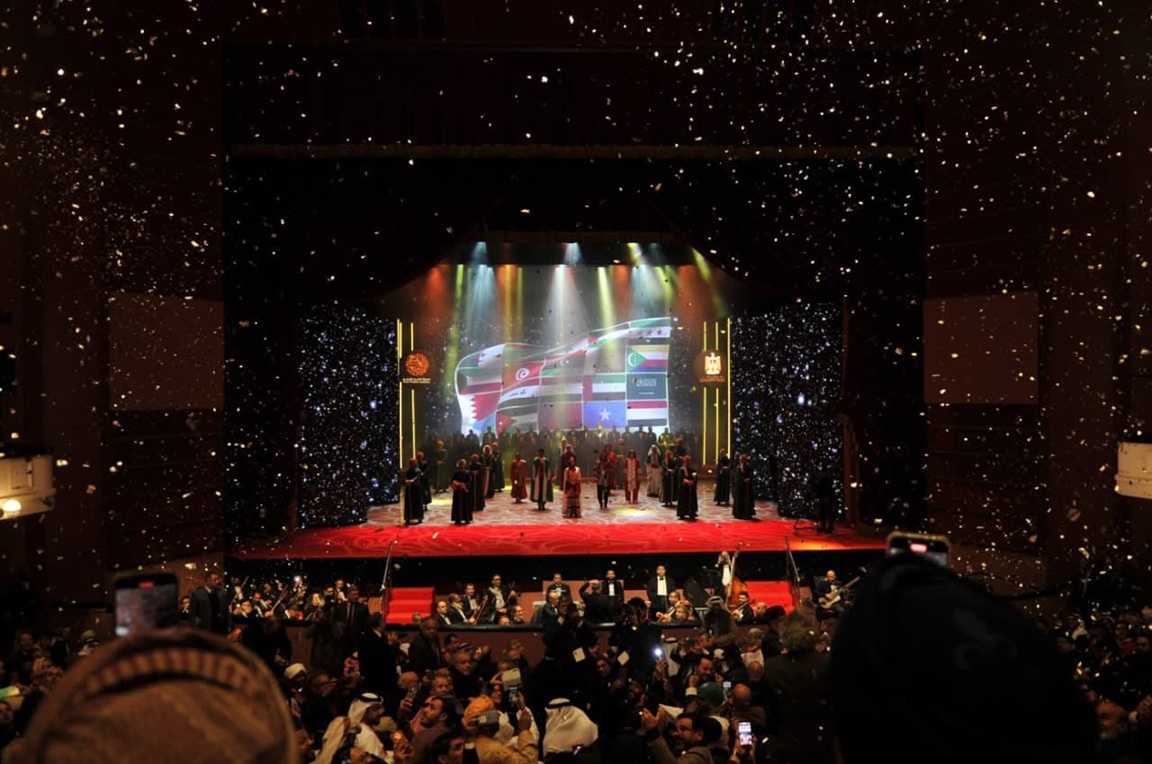 وسادت أجواء من البهجة والاحتفاء بالمسرح العربي مع تشييد أعلام الدول العربية المشاركة على شرفات المسرح الكبير حيث قدمت الفرق الفنية تنويعات راقصة مستوحاة من التراث العربي لتلك الدول.