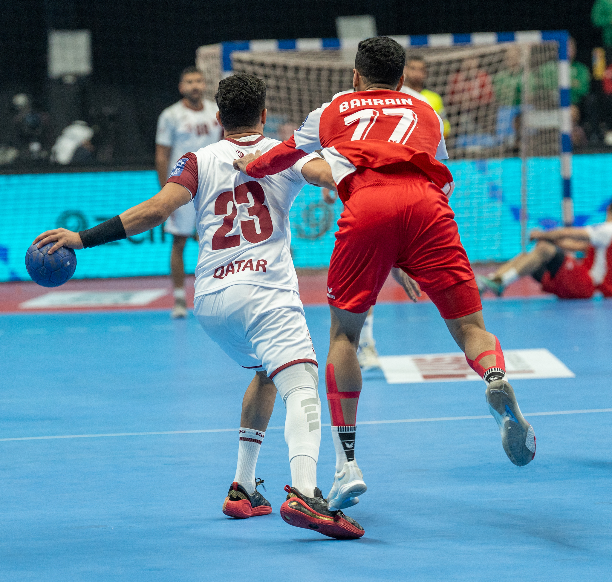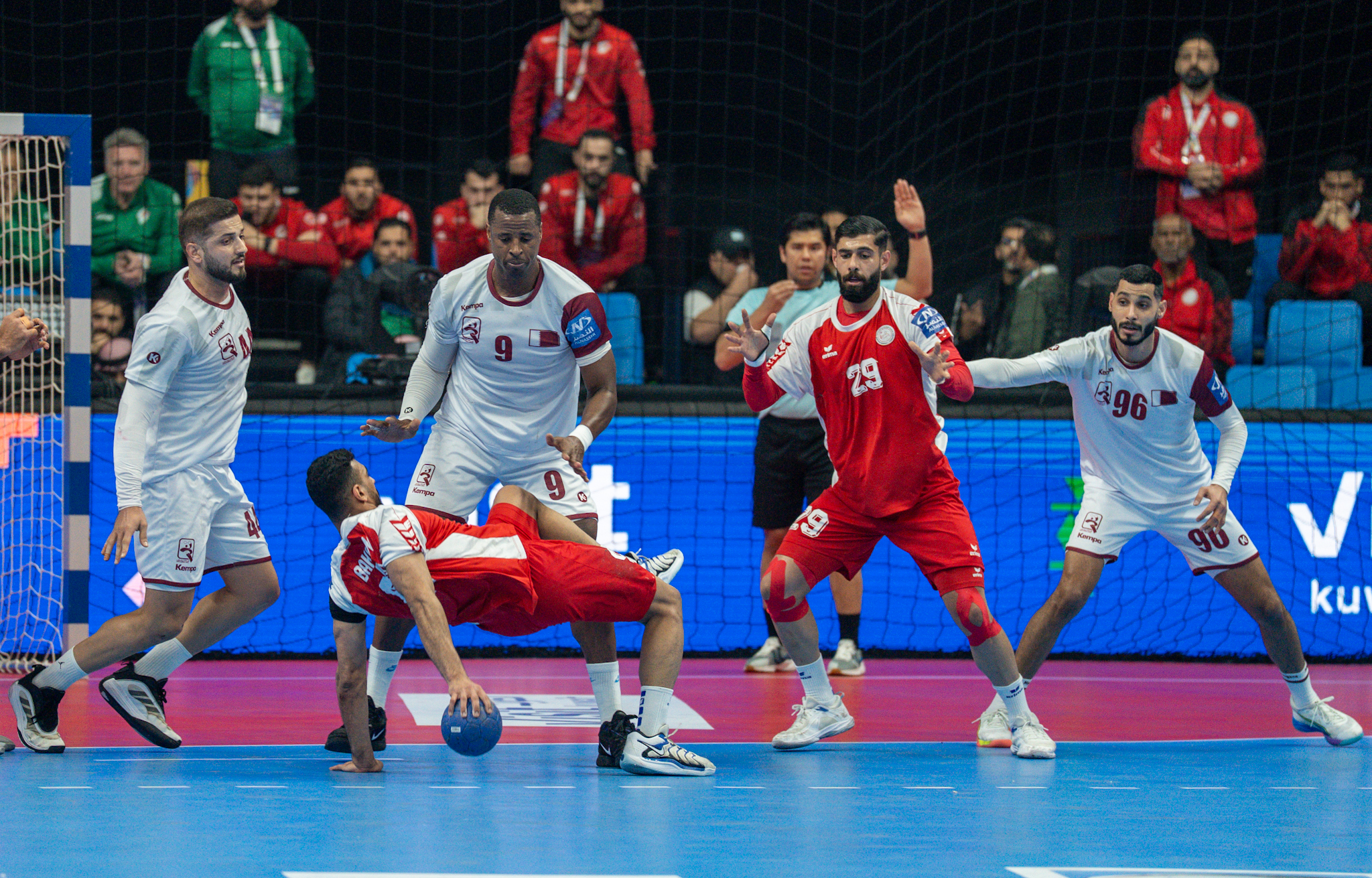 وعلى صالة مجمع الشيخ سعد العبد الله للألعاب الرياضية قدم منتخب البحرين شوطا أولا قويا تمكن فيه من مجاراة نظيره القطري خصوصا من الناحية البدنية ليخرج متقدما (14-11).