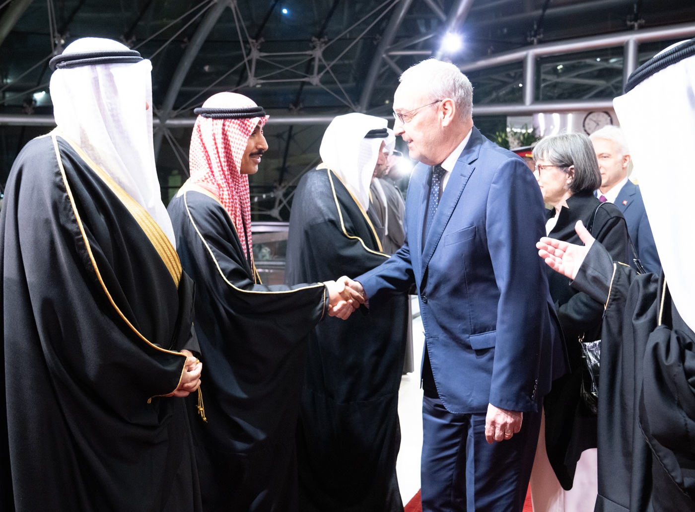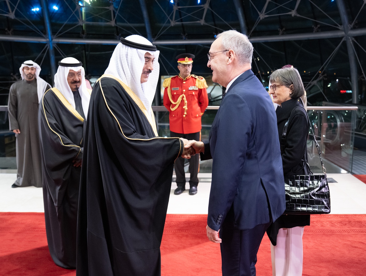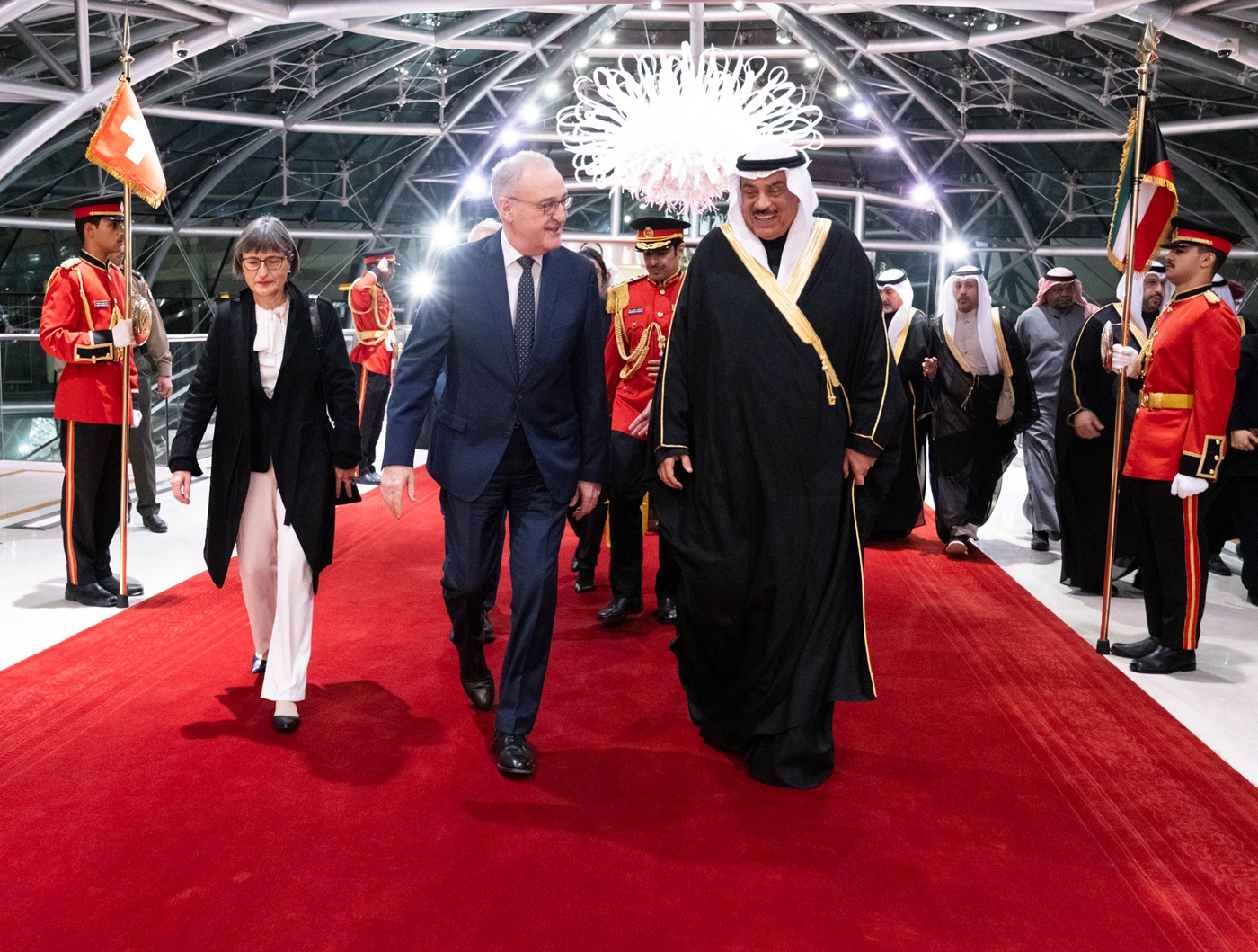 كما كان في استقبال فخامته معالي وزير شؤون الديوان الأميري الشيخ حمد جابر العلي الصباح ومعالي رئيس ديوان سمو ولي العهد الشيخ ثامر جابر الأحمد الصباح ومعالي المستشار بديوان رئيس مجلس الوزراء رئيس بعثة الشرف المرافقة الشيخ الدكتور باسل حمود المالك الصباح ومعالي وزير الأشغال العامة رئيس بعثة الشرف المرافقة لحرم فخامة رئيس الاتحاد السويسري الدكتورة نورة محمد المشعان ومساعد وزير الخارجية لشؤون أوروبا سعادة السفير صادق محمد معرفي.