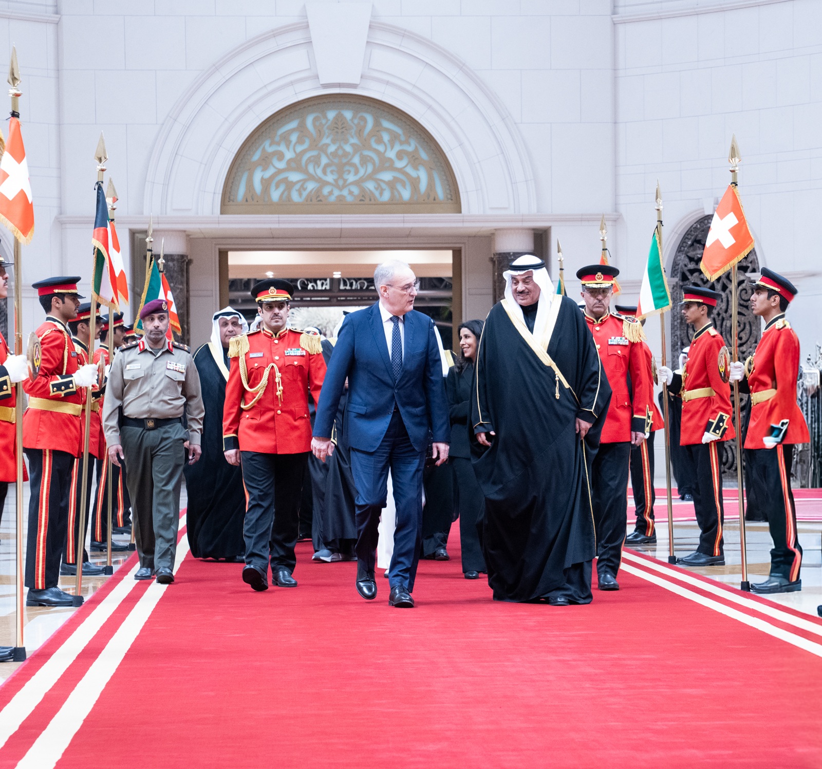 سمو ولي العهد الشيخ صباح خالد الحمد الصباح مستقبلا رئيس الاتحاد السويسري غي بارميلان