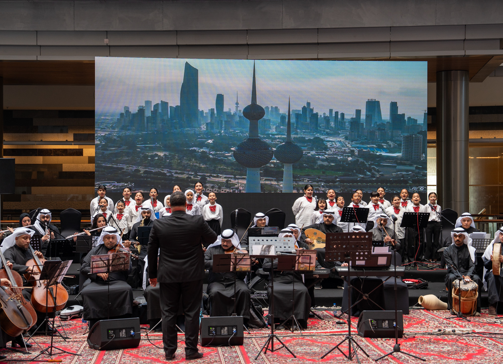 وتزين بهو الوزارة بألوان الفرح بالأعياد الوطنية في احتفال بهيج جمع طلبة مدارس ضمن أجواء من الفخر والانتماء حيث قدموا عروضا موسيقية مميزة تنوعت بين الأغاني الوطنية و(العرضة بالسيوف) و(الفن البحري) جسدت حب الوطن واعتزاز الأجيال الجديدة بتاريخ الكويت المجيد.