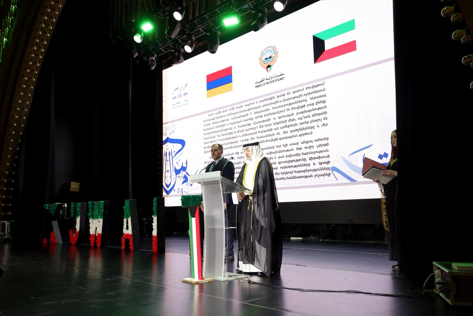 وفي يريفان أقام سفير دولة الكويت لدى أرمينيا محمد العريفان حفلا رفع خلاله أسمى آيات التهاني والتبريكات إلى مقام حضرة صاحب السمو أمير البلاد الشيخ مشعل الأحمد الجابر الصباح حفظه الله ورعاه وسمو ولي العهد الشيخ صباح خالد الحمد الصباح حفظه الله وسمو الشيخ أحمد عبدالله الأحمد الصباح رئيس مجلس الوزراء حفظه الله والشعب الكويتي الكريم.