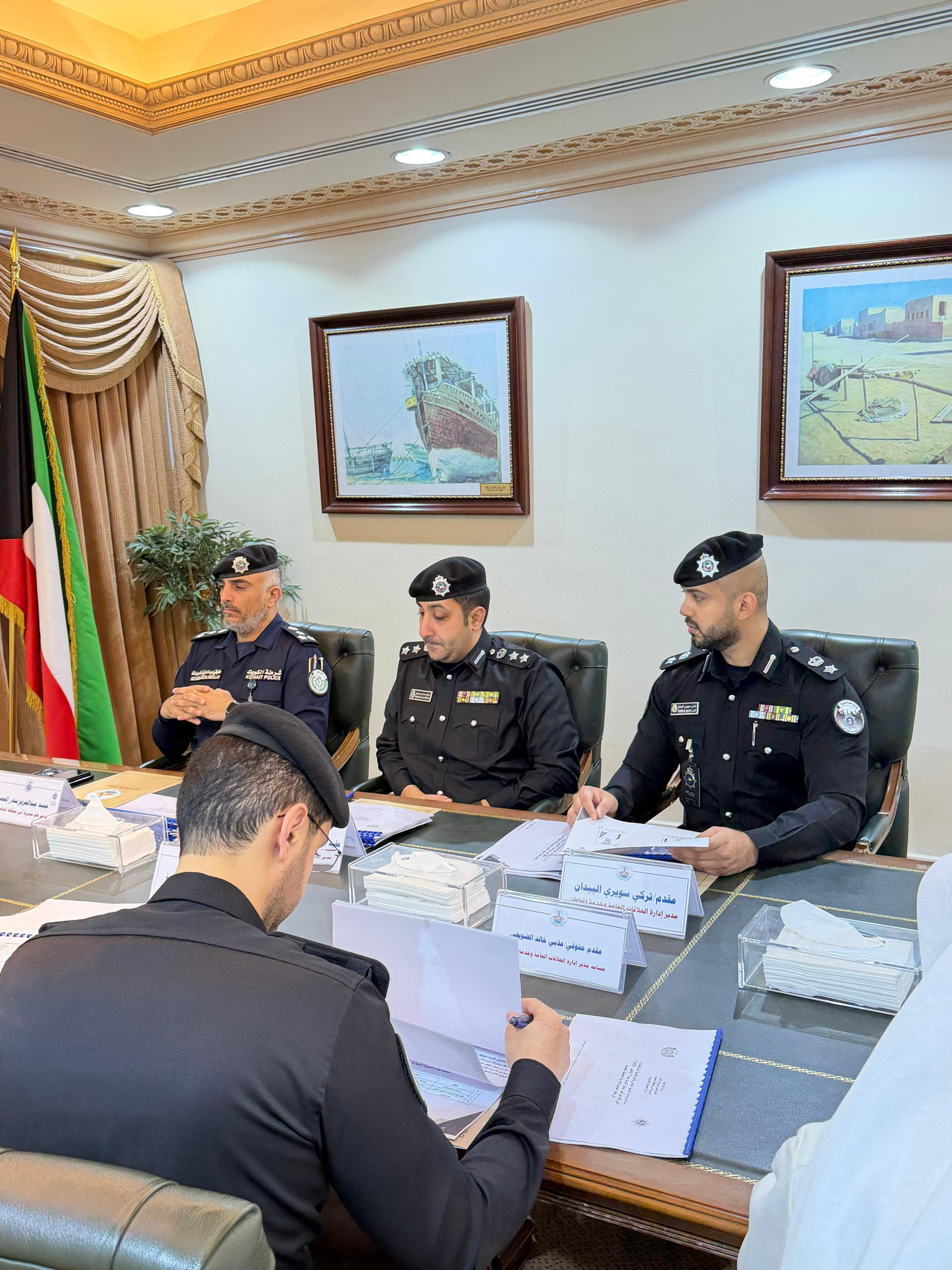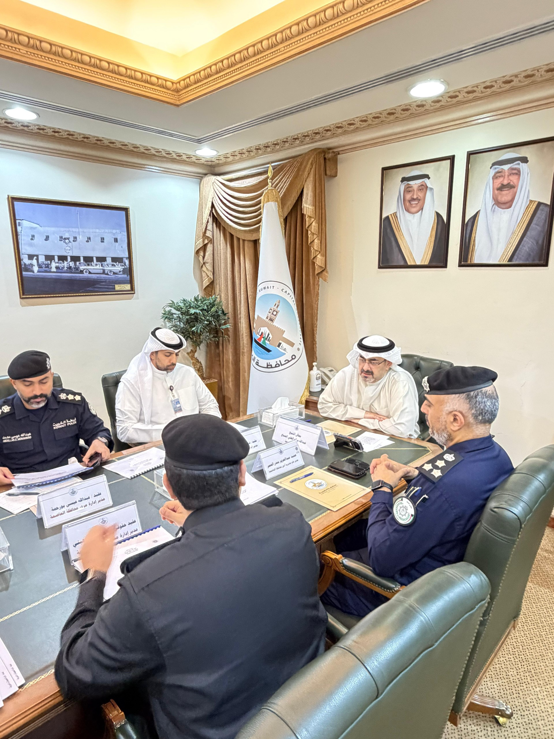 محافظ العاصمة الشيخ عبدالله الصباح خلال ترؤسه اجتماع اللجنة الأمنية في مجلس المحافظة بحضور عدد من القيادات الأمنية من مديرية أمن محافظة العاصمة وإدارة الرقابة الأمنية والإدارة العامة للمرور
