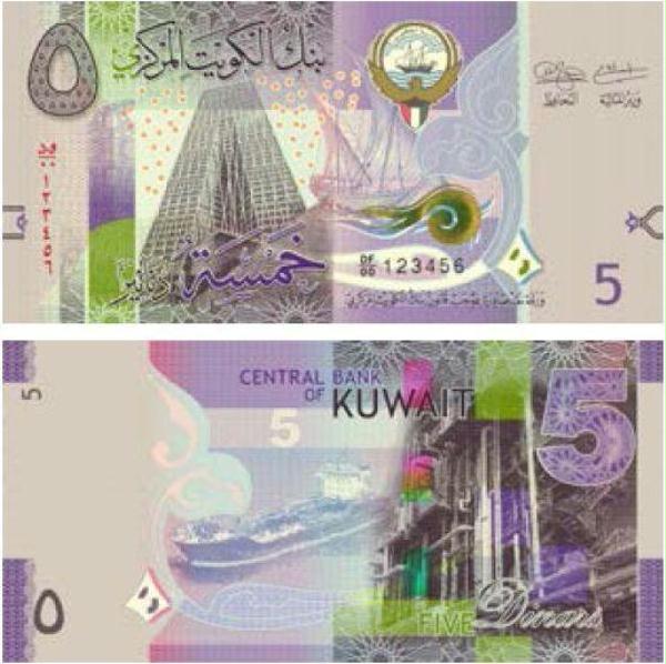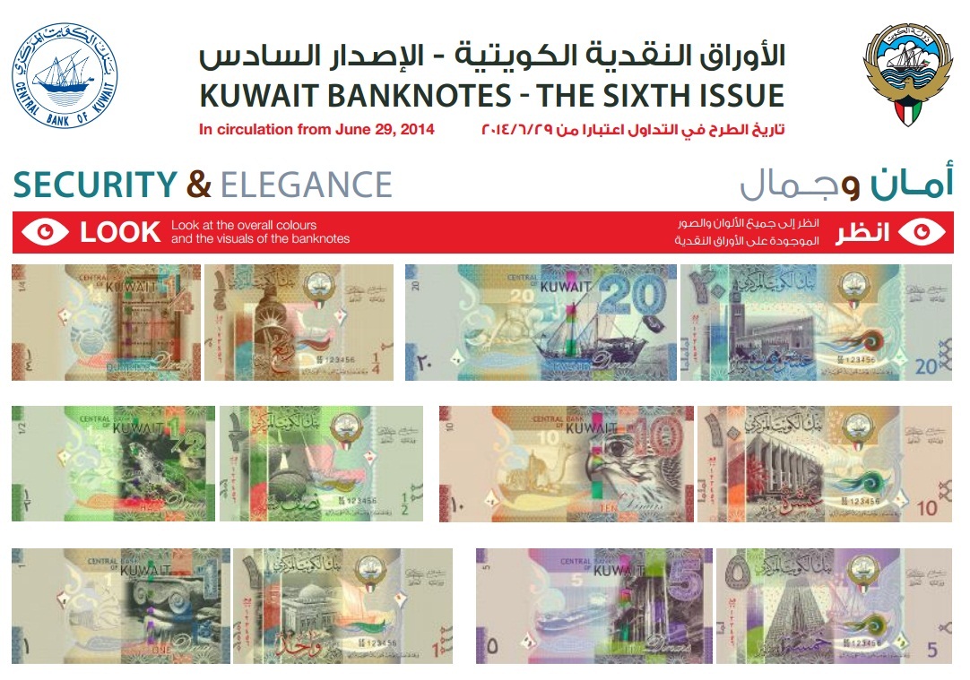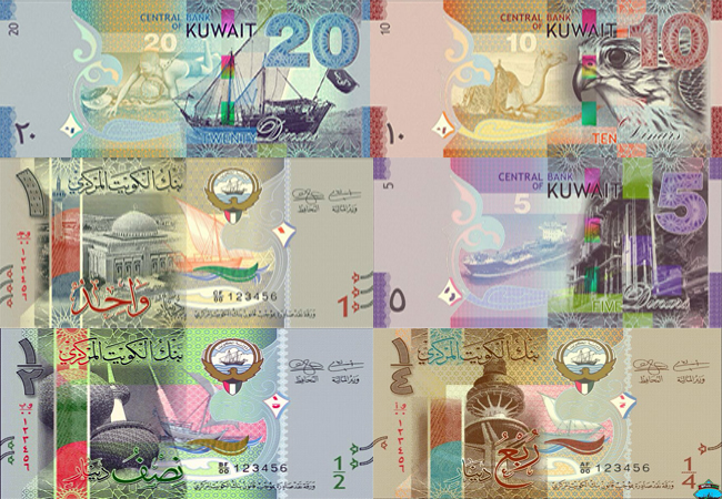 Kuwait flag is a main feature of the new bills, in affirmation of the national identity. Each paper shows the Kuwaiti desert and marine environments, along with historic sites namely Failaka island, the first minted coin bearing the name of Kuwait and heritage sites such the old Kuwaiti gate and industrial potentials and zones, including an oil tanker and a refinery.