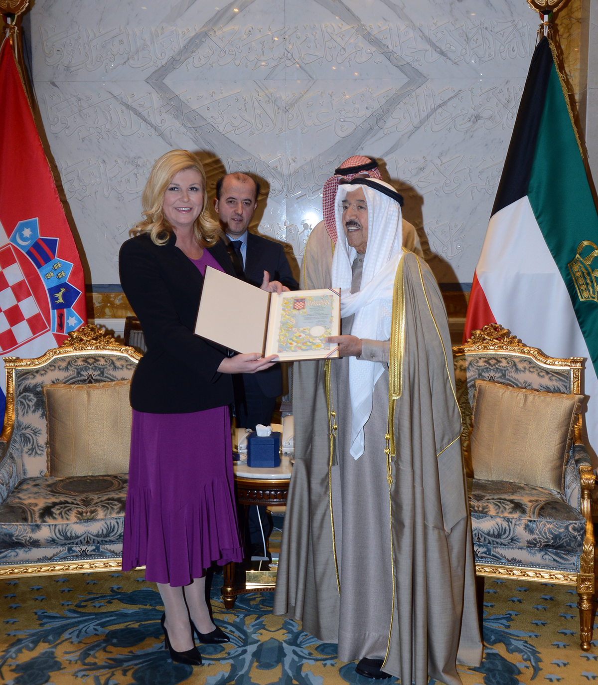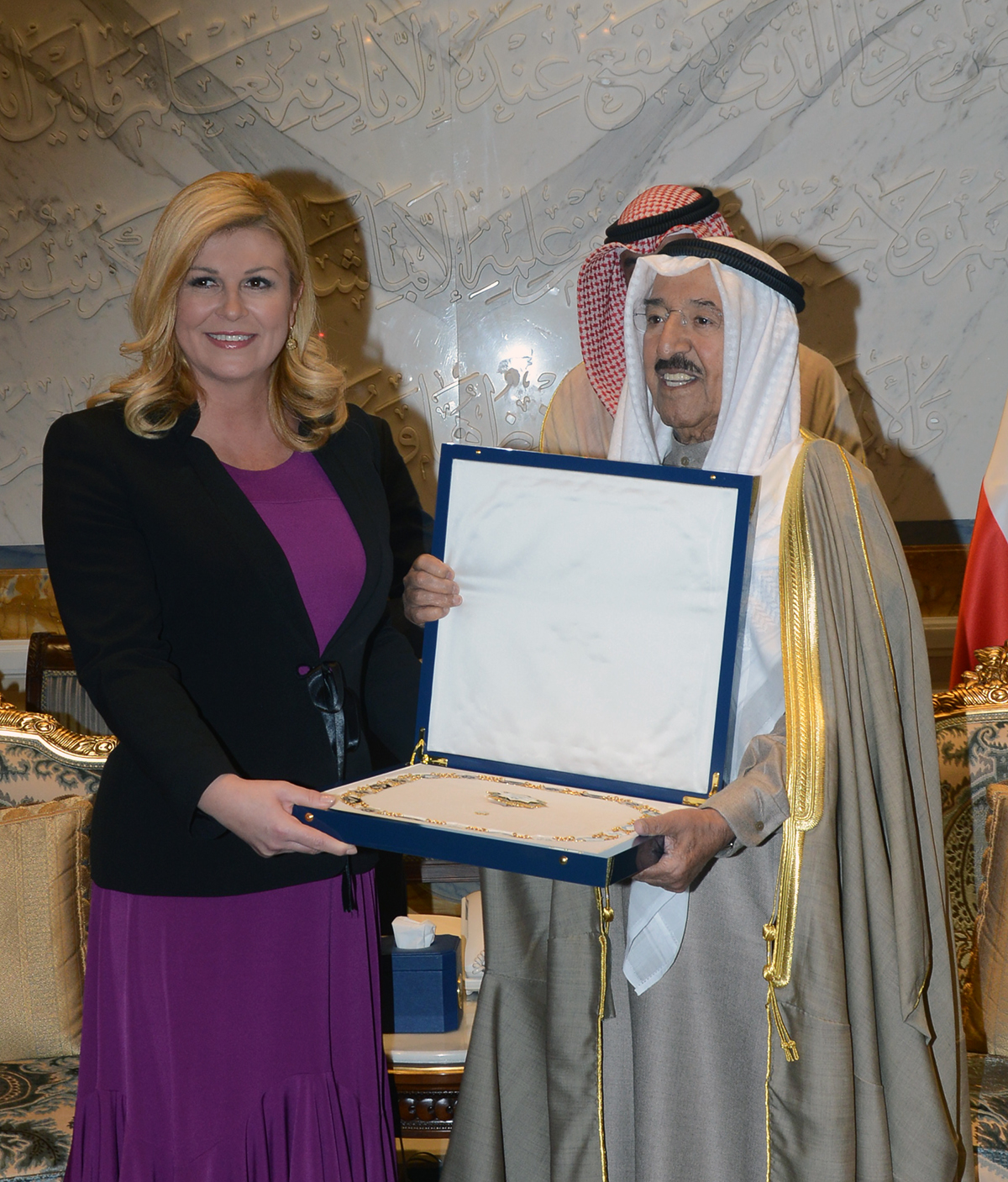 His Highness the Amir Sheikh Sabah Al-Ahmad Al-Jaber Al-Sabah presented visiting Croatian President Kolinda Grabar-Kitarovic on Sunday with the "Order of Mubarak Al-Kabeer", in recognition of the European nation's support of Kuwait.