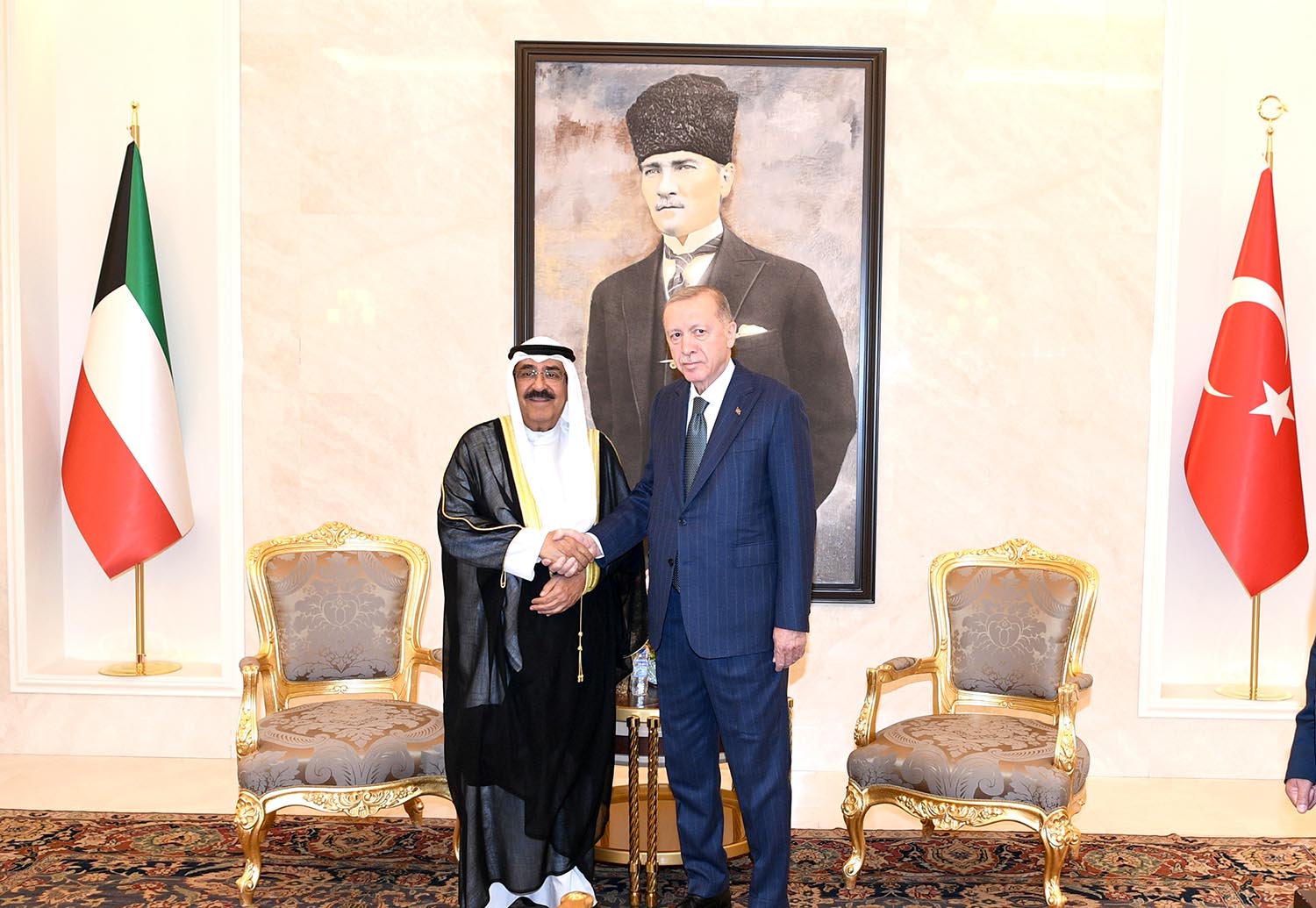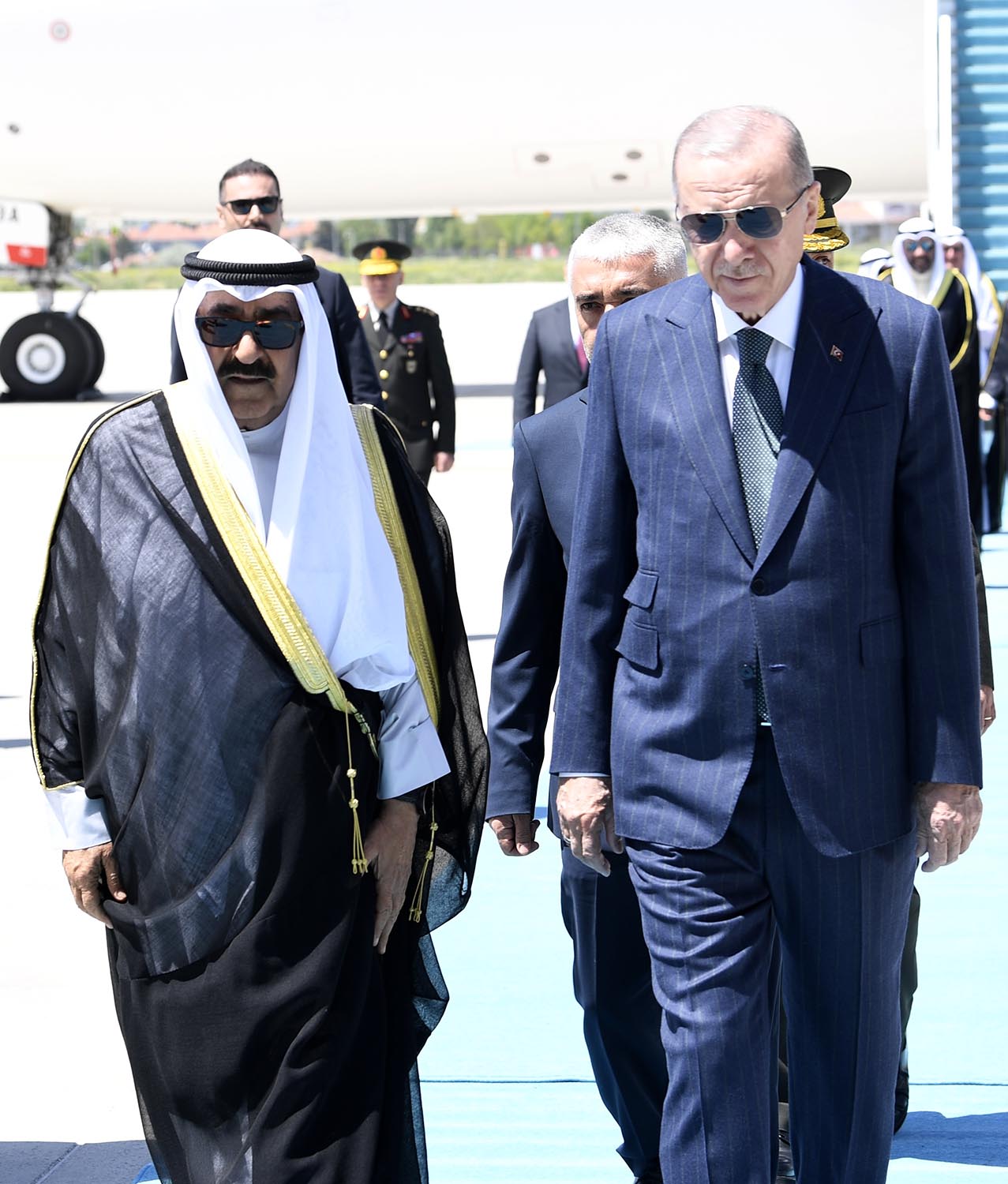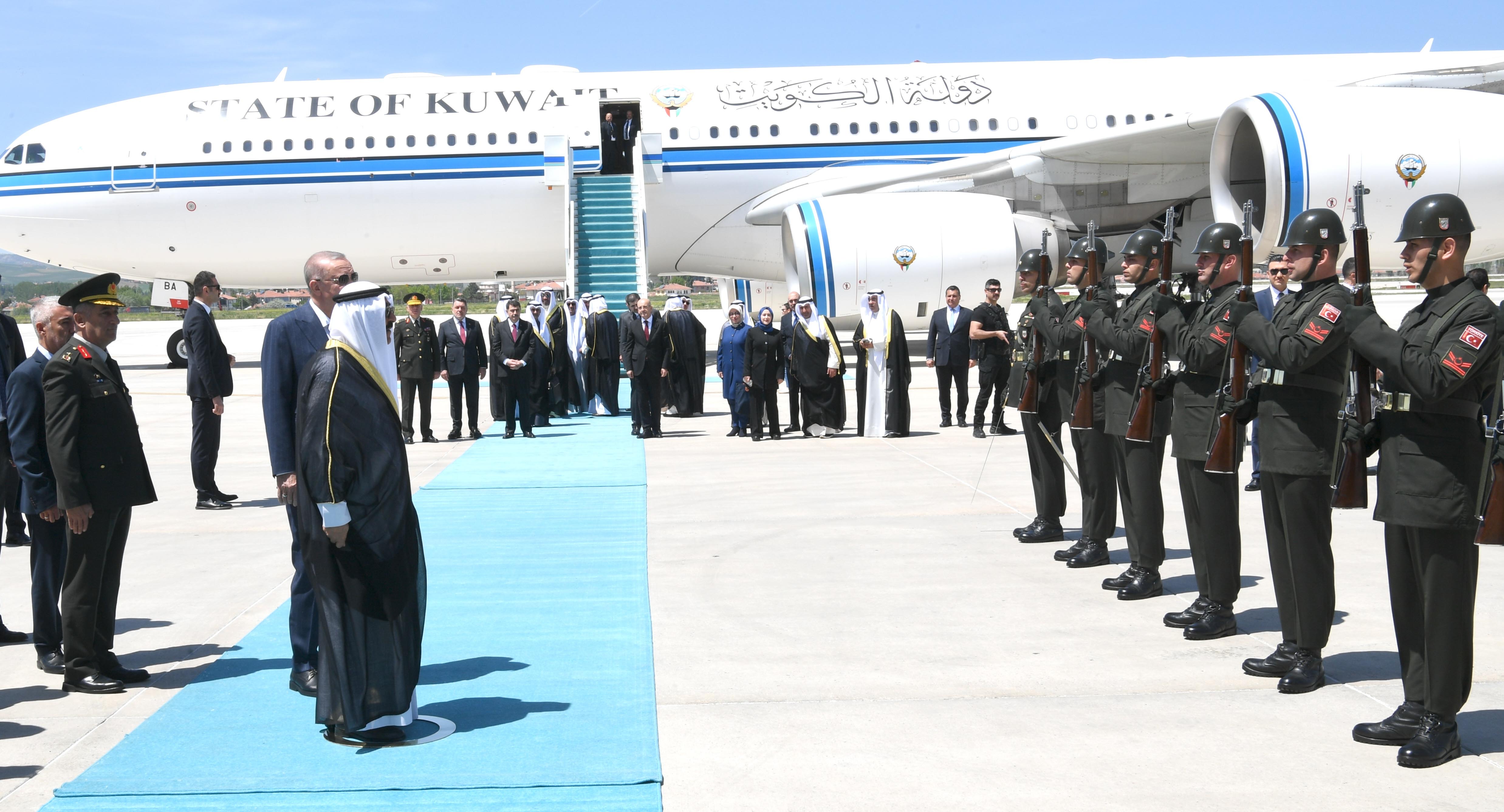 His Highness the Amir was welcomed by Turkish President Recep Tayyip Erdogan, Turkish Minister of Treasury and Finance and Chief of the Accompanying Mission of Honor Mehmet Simsek, Governor of Ankara Vasip Sahin, Kuwaiti Ambassador in Turkiye Wael Yousef Al-Enezi and Kuwaiti Consul in Istanbul Mohammad Sultan Al-Sharji.