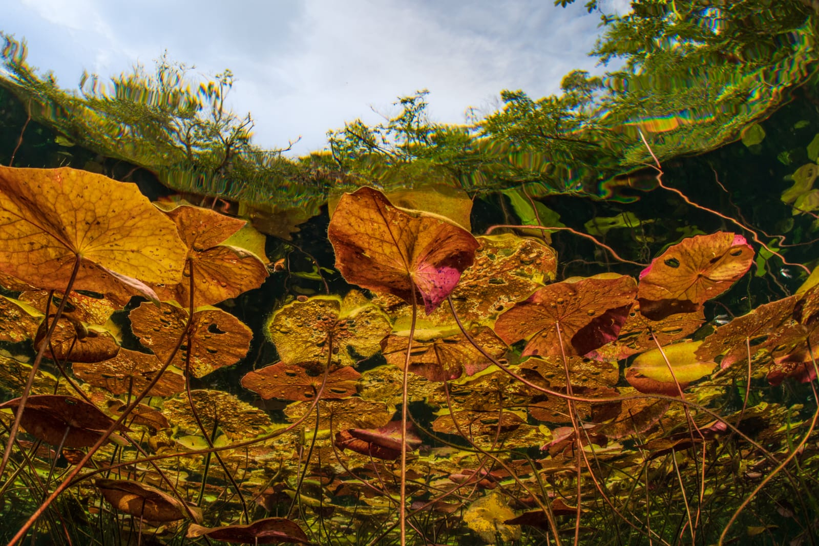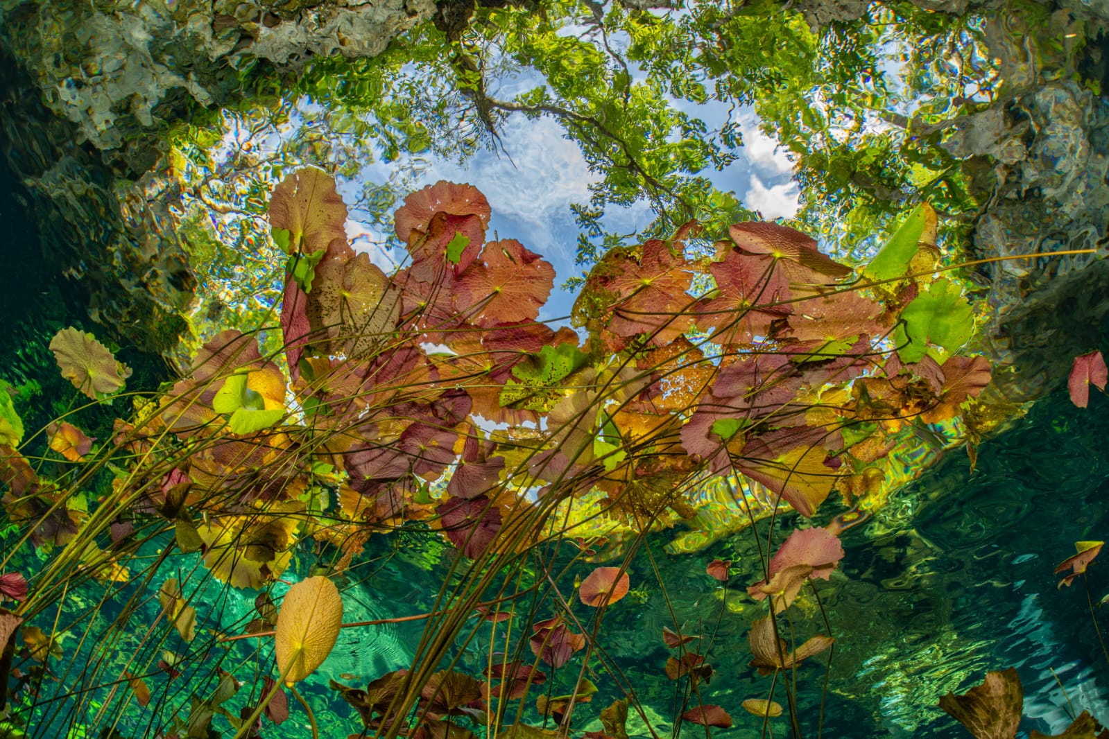 His work captures the surreal intersection of submerged aquatic life and the vibrant terrestrial greenery above, forming a masterful tableau of nature's primary colors.