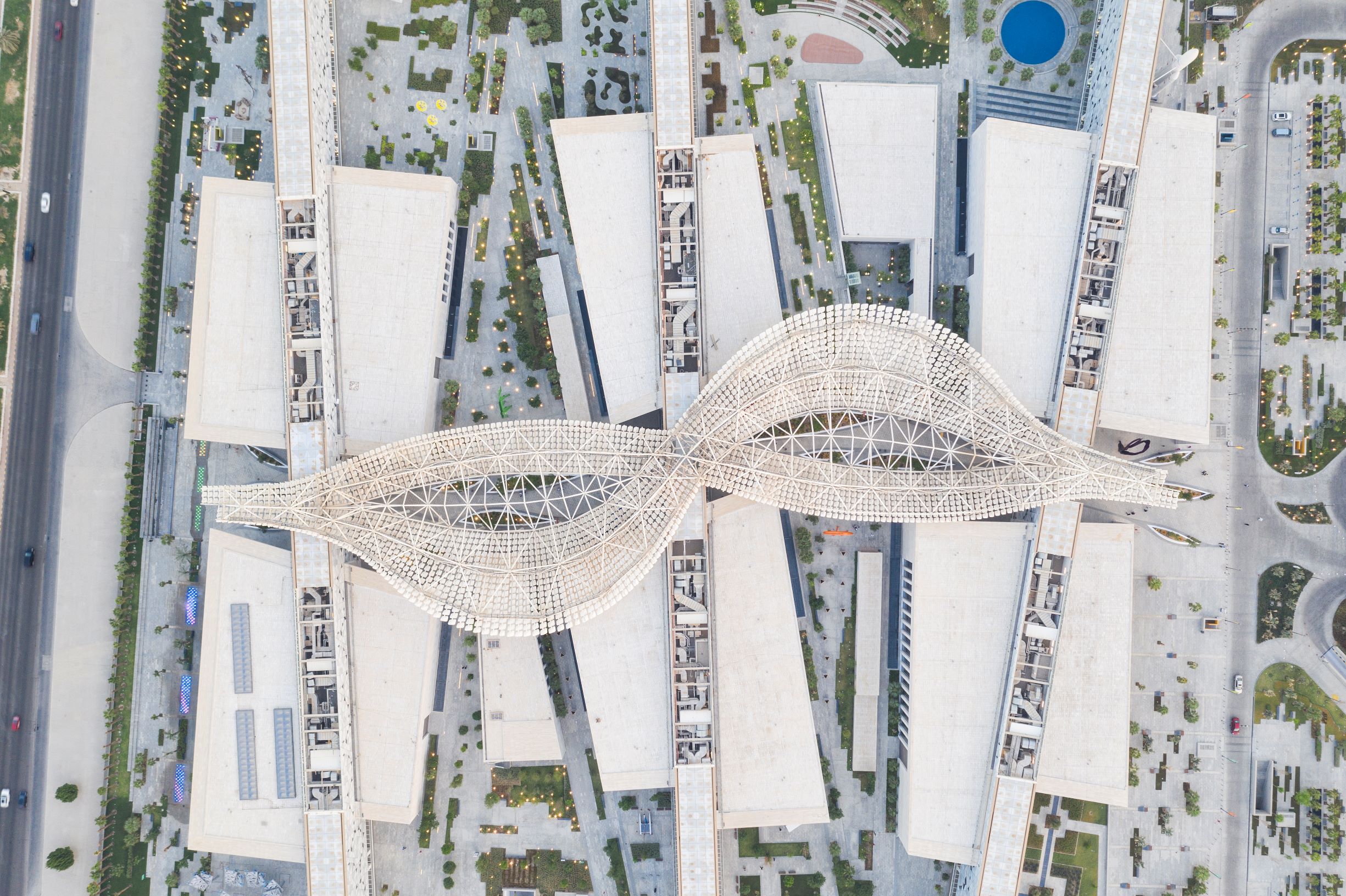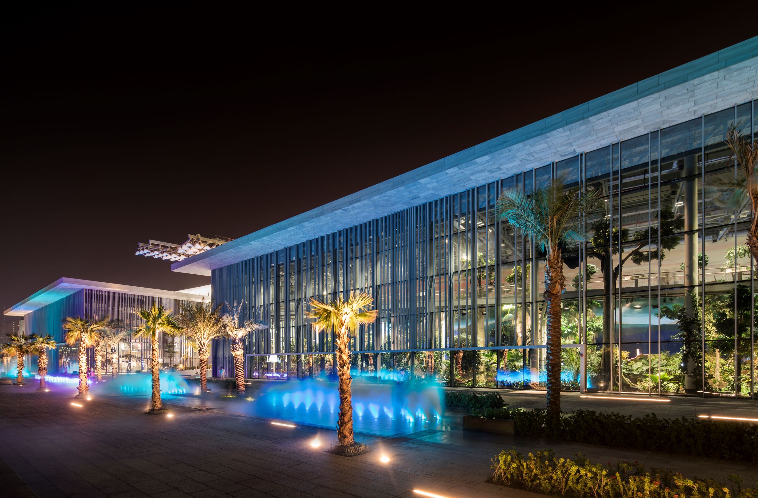 وتزين المركز 25 نافورة مياه ونوافير نفاثة موزعة حول المحيط الخارجي للمباني لتضيف ألقا جماليا إلى ذلك الصرح وتبهج الزائرين بنسمات المياه الجميلة ورذاذها العليل. ويضم المركز متاحف يبلغ عدد صالاتها 22 صالة عرض تحوي أكثر من 1100 قطعة من المعروضات فيما ساهم في تجهيزه نحو 100 جهة متخصصة من 13 بلدا مما يعد تعاونا دوليا متميزا.