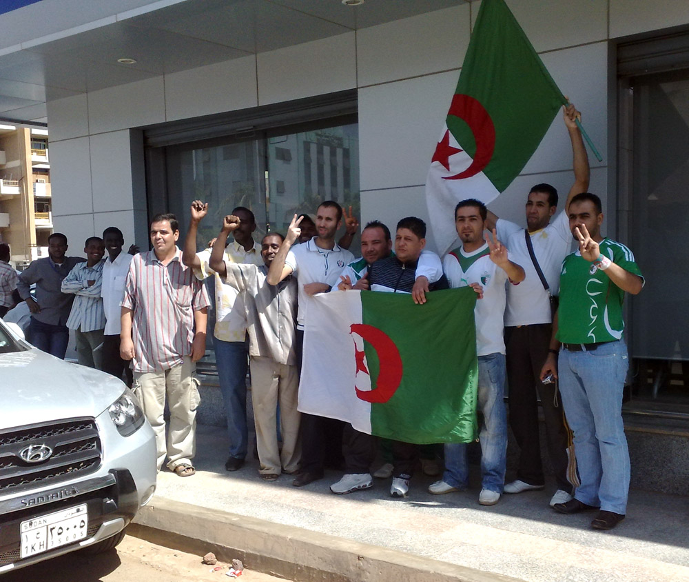 وأمام السفارة المصرية حملت الجماهير المصرية ومشجعي الفريق الأحمر من السودانيين الأعلام المصرية التي تم توزيعها عليهم فيما تجمع مشجعو فريق الجزائر أمام برج الفاتح المطل على النيل حاملة أعلام الجزائر وتبادلت التحية من المارة والسيارات التي رفع بعضا من أصحابها علم الفريق الأخضر. (النهاية) ح ح ا / أ م س كونا171938 جمت نوف 09
