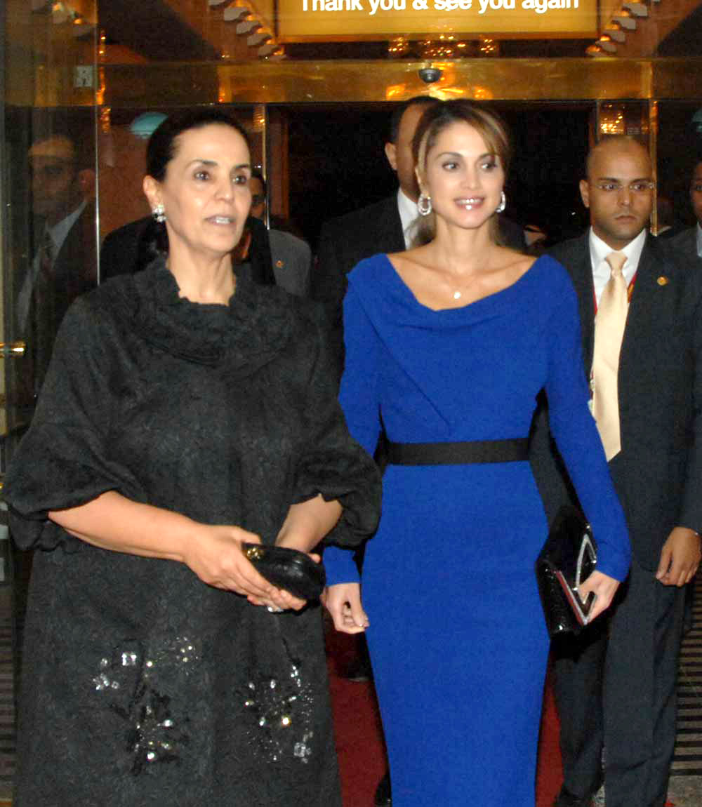 جلالة الملكة رانيا العبدالله ورئيسة بعثة الشرف المرافقة رئيسة مركز العمل التطوعي الشيخة امثال الاحمد الجابر الصباح أثناء حفل عشاء خيري لدعم مبادرة مدرستي فلسطين