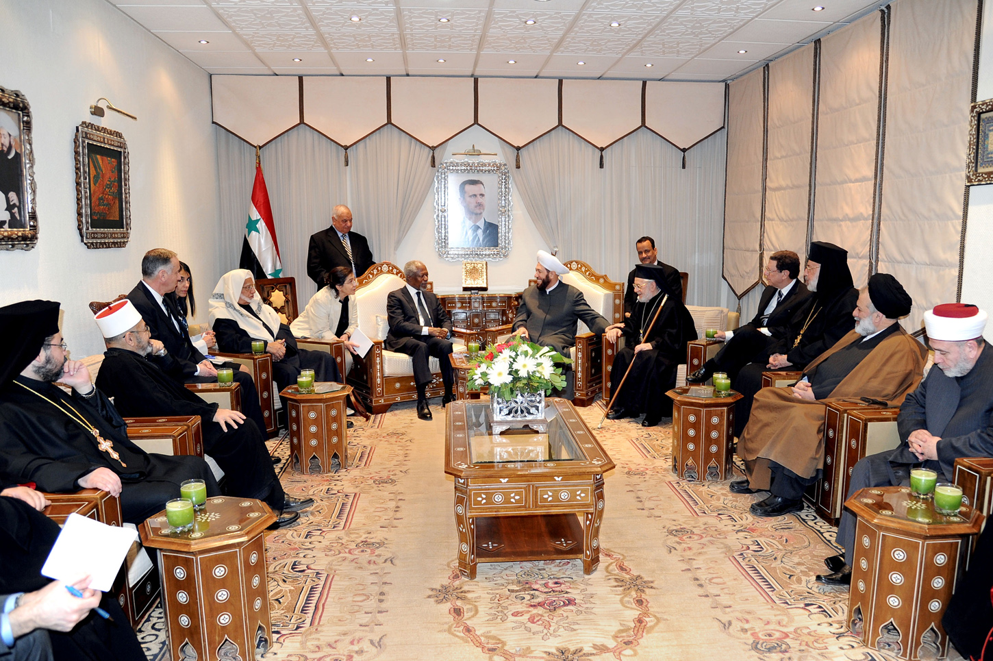 المبعوث المشترك للامم المتحدة وجامعة الدول العربية الى سوريا كوفي عنان اثناء لقائه بمفتي عام سوريا الشيخ بدر الدين حسون