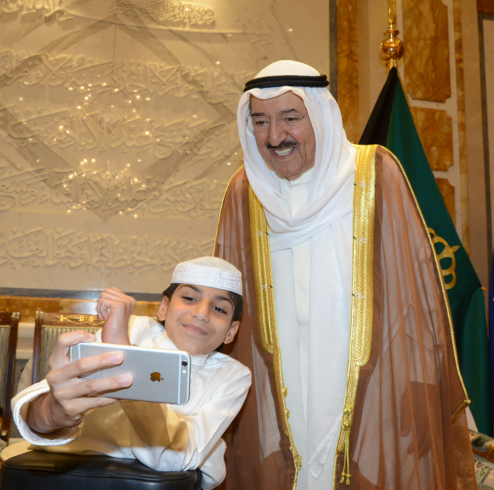 His Highness the Amir Sheikh Sabah Al-Ahmad Al-Jaber Al-Sabah receives  two Qatari boys Ghanim Mohammad Al-Muftah and Ahmad Mohammad Al-Muftah and Ghanim Around-the-World Tour team