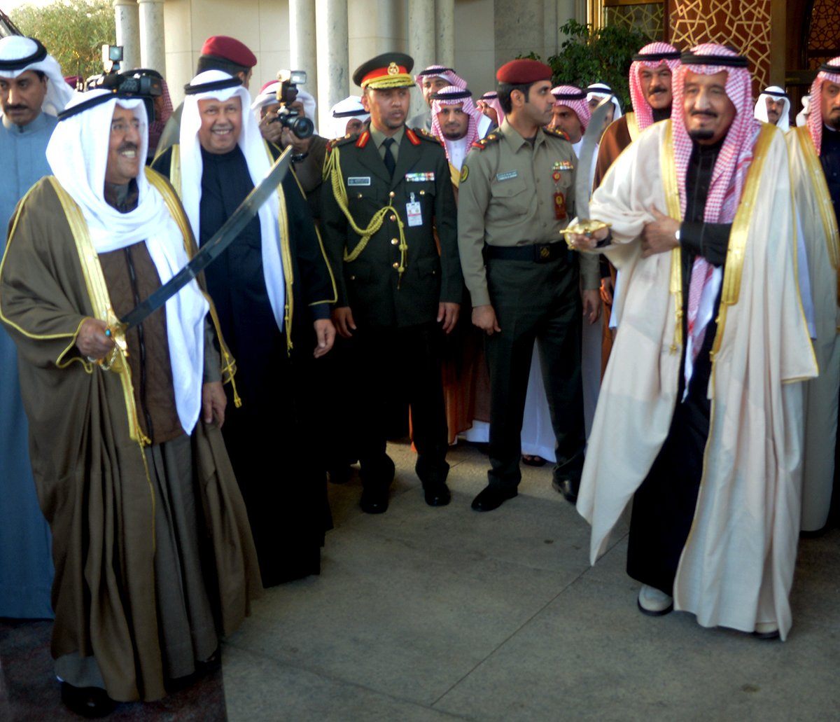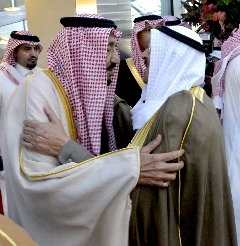 The Custodian of the Two Holy Mosques King Salman Bin Abdulaziz was welcomed at the airport by His Highness the Amir, His Highness the Crown Prince Sheikh Nawaf Al-Ahmad Al-Jaber Al-Sabah, senior sheikhs, Deputy Chief of the National Guards Sheikh Meshaal Al-Ahmad Al-Jaber Al-Sabah, His Highness Sheikh Nasser Al-Mohammad Al-Ahmad Al-Sabah, His Highness the Prime Minister Sheikh Jaber Al-Mubarak Al-Hamad Al-Sabah, Minister of the Amiri Diwan Affairs Sheikh Nasser Sabah Al-Ahmad Al-Sabah, the First Deputy Prime Minister and Foreign Minister Sheikh Sabah Al-Khaled Al-Hamad Al-Sabah, Deputy Premier and Interior Minister Sheikh Mohammad Al-Khaled Al-Hamad Al-Sabah, Deputy Minister of Amiri Diwan Affairs Sheikh Ali Jarrah Al-Sabah, Deputy Premier and Finance Minister and Acting Oil Minister Anas Al-Saleh, ministers, governors, senior State officials, ranking chiefs of the Army, the Police, the National Guards and the fire department.