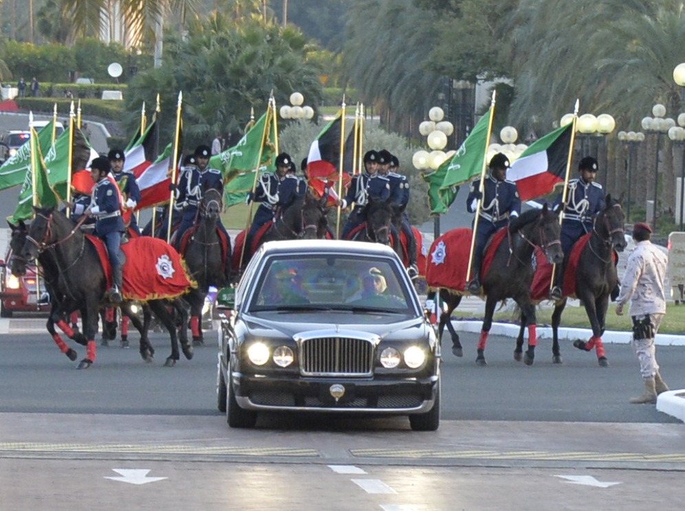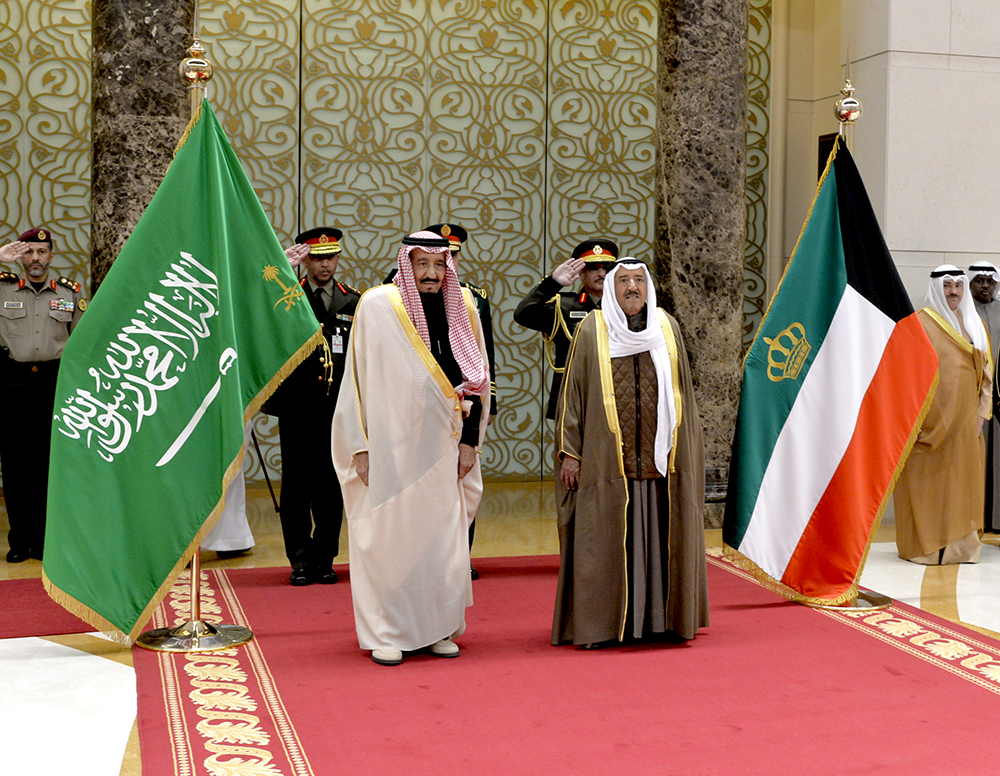 The Saudi King arrived to formal reception ceremony during which the National Anthems of the two brotherly countries were played. The eminent guest proceeded, with company of His Highness the Amir, to display the Guards of Honor from units of the Kuwait Army.