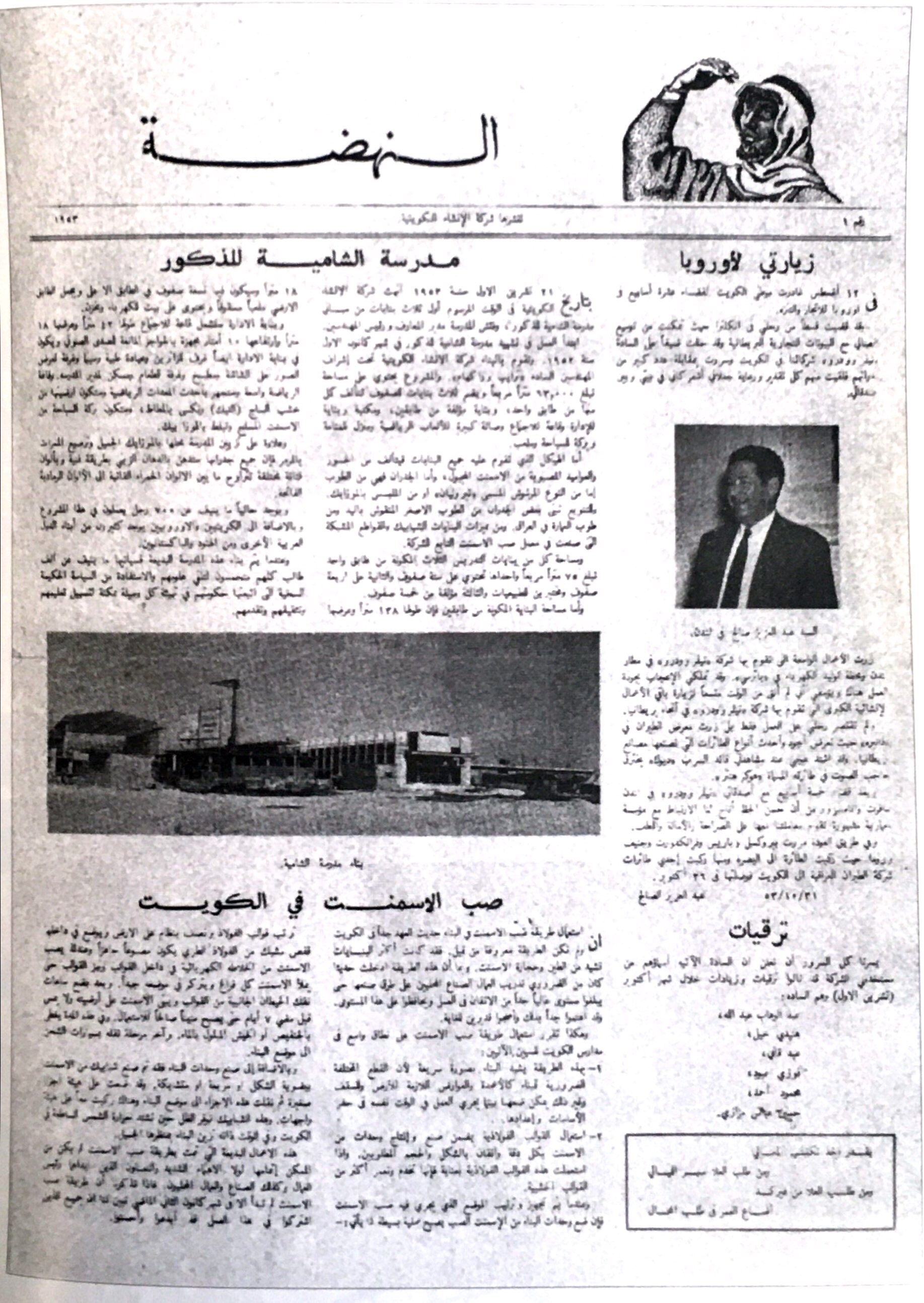 وذكرت المجلة في العدد 38 الصادر في أبريل عام 2012 أنه في عام 1953 أنهت شركة الإنشاء الكويتية أول ثلاث بنايات من مباني مدرسة الشامية للبنين وتلك الشركة كانت وكيلا لشركة إنجليزية كانت تساهم مع أربع غيرها في أعمال البناء والتعمير بالكويت حينذاك من خلال وكلائها الكويتيين.