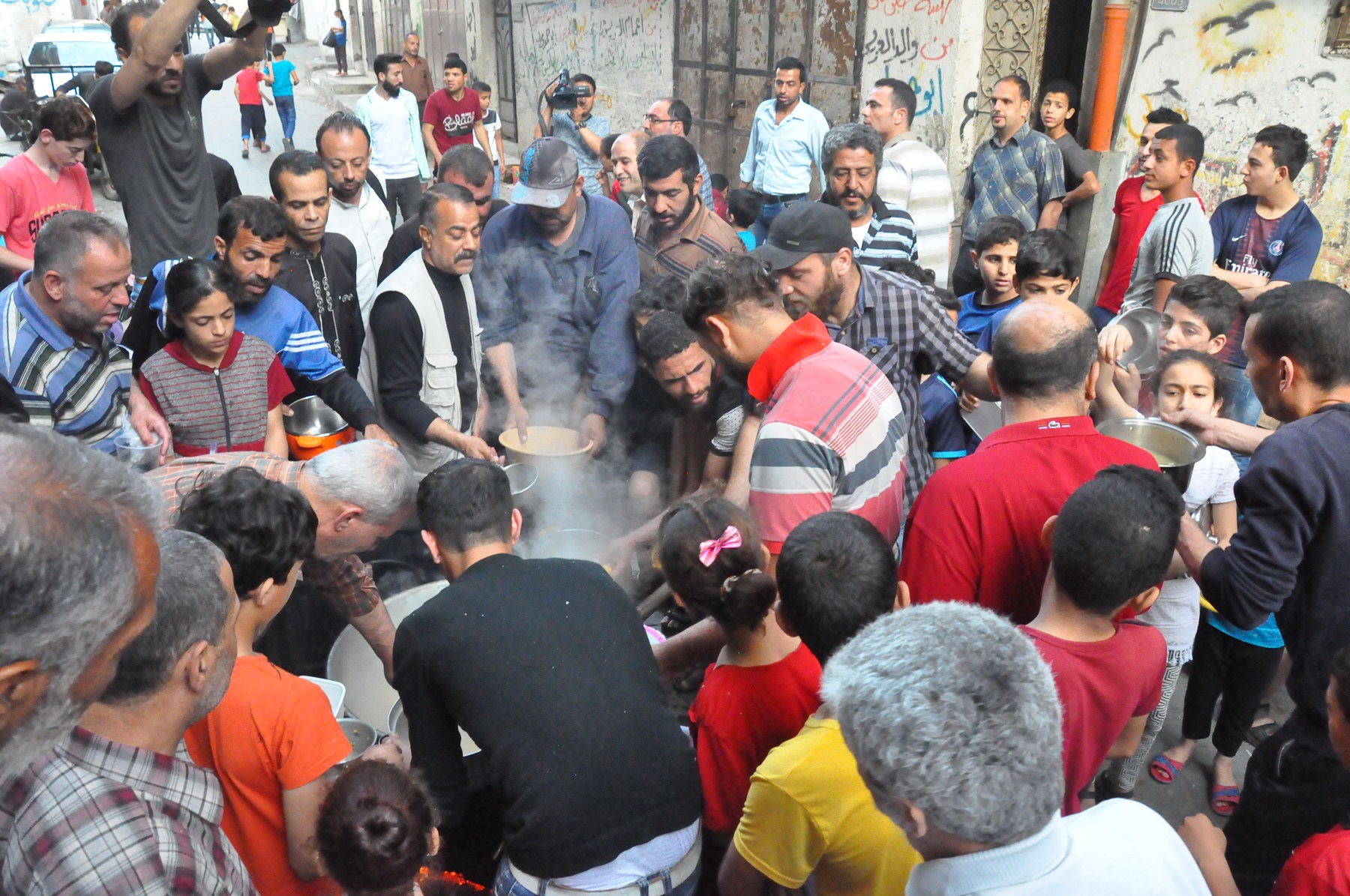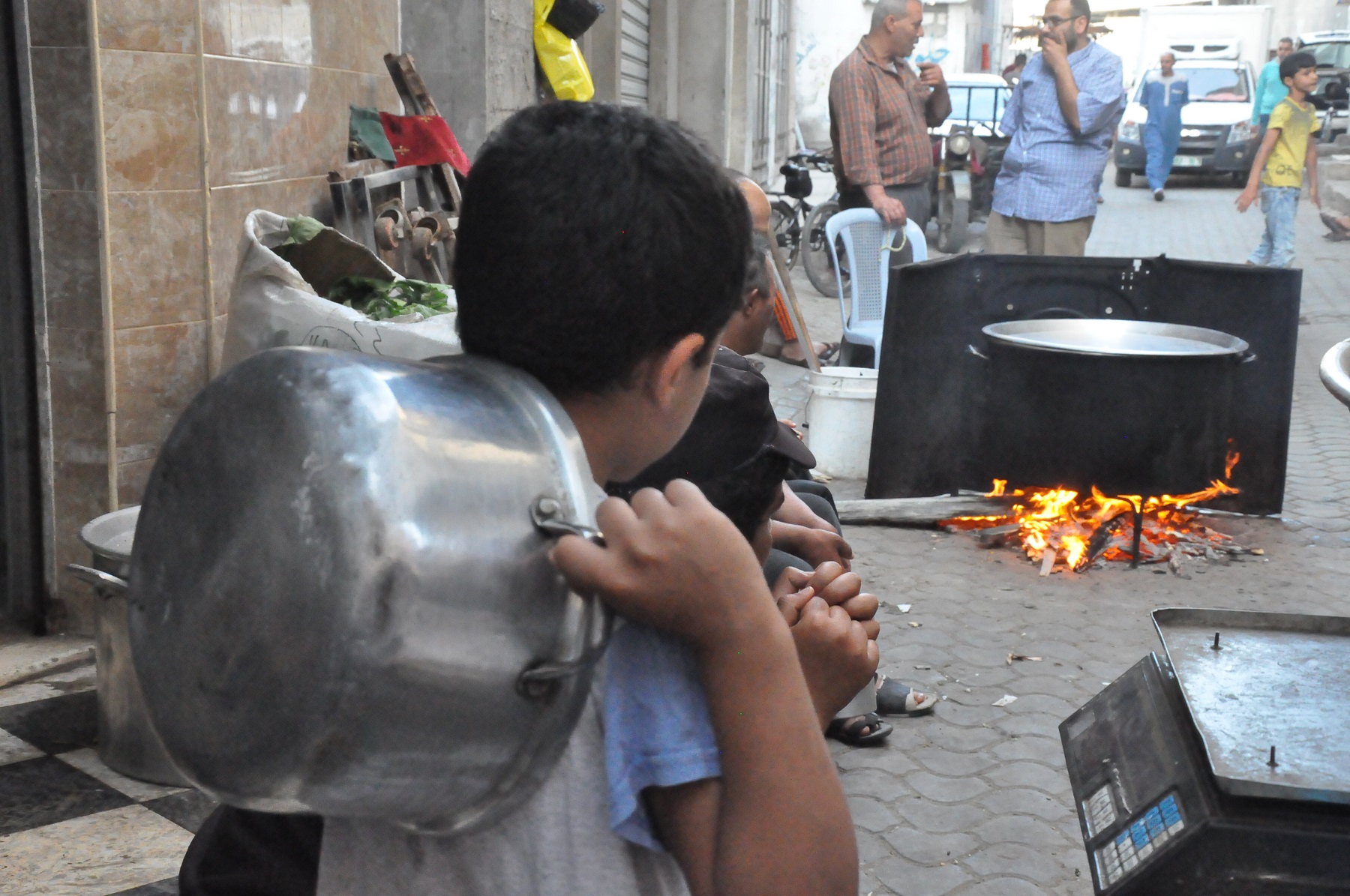 Expressing their defiance of the Israeli blockade that began in summer 2007, people flock together to break their fast despite the scarcity of food material.