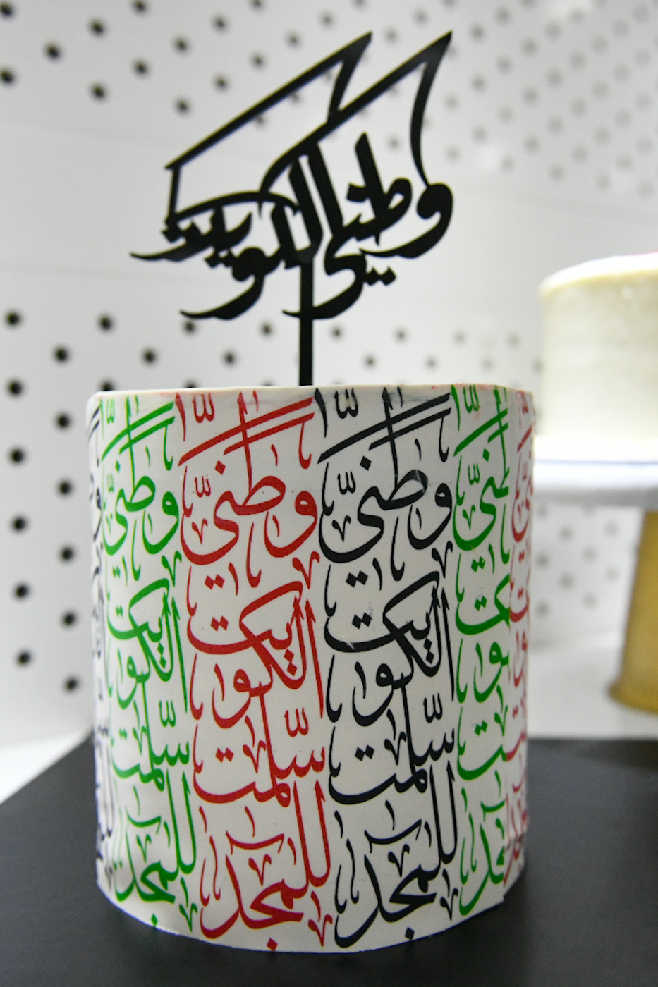 Kuwaiti map painted on a slice of cake and decorated with colors of Kuwaiti flag