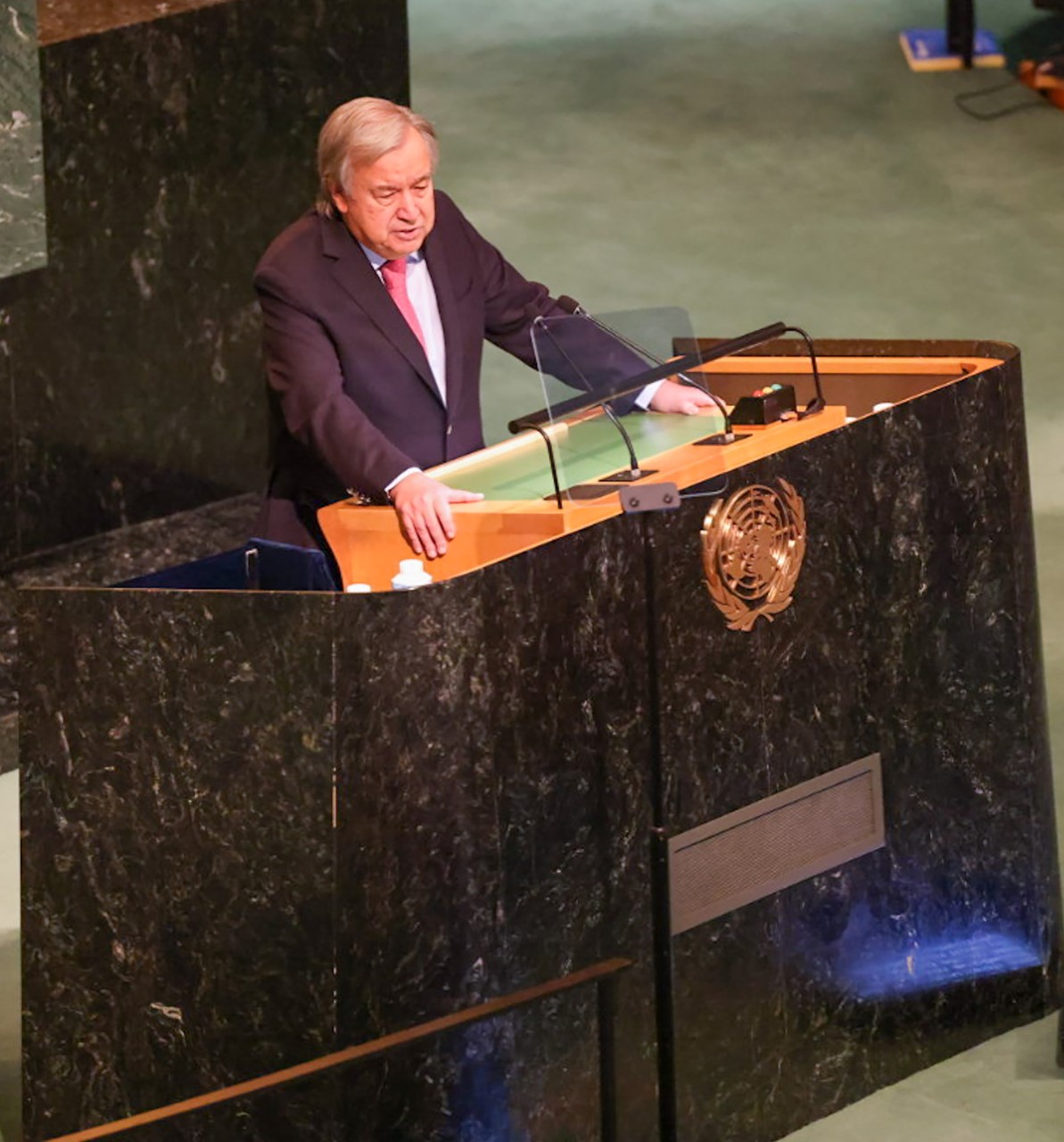 On climate change, the UN chief said, "Global greenhouse gas emissions need to be slashed by 45 percent by 2030 to have any hope of reaching net zero by 2050."