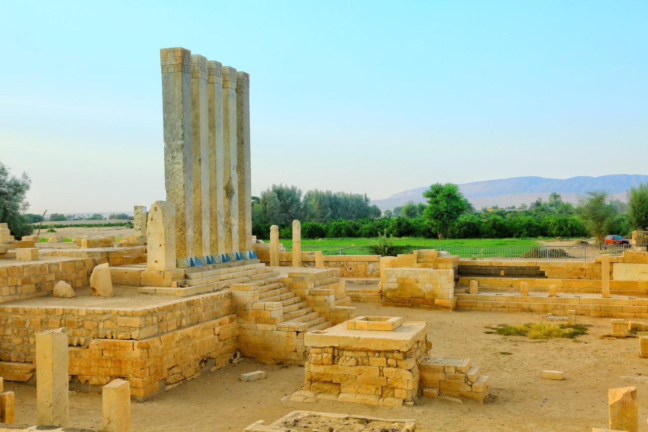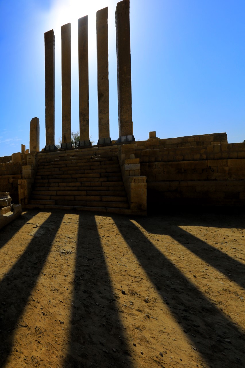 وتعد الأعمدة الستة المزخرفة من أبرز معالم المعبد ويبلغ ارتفاع كل عمود من العمدان الخمسة المكتملة 12 مترا وتزن حوالي 17 طنا.