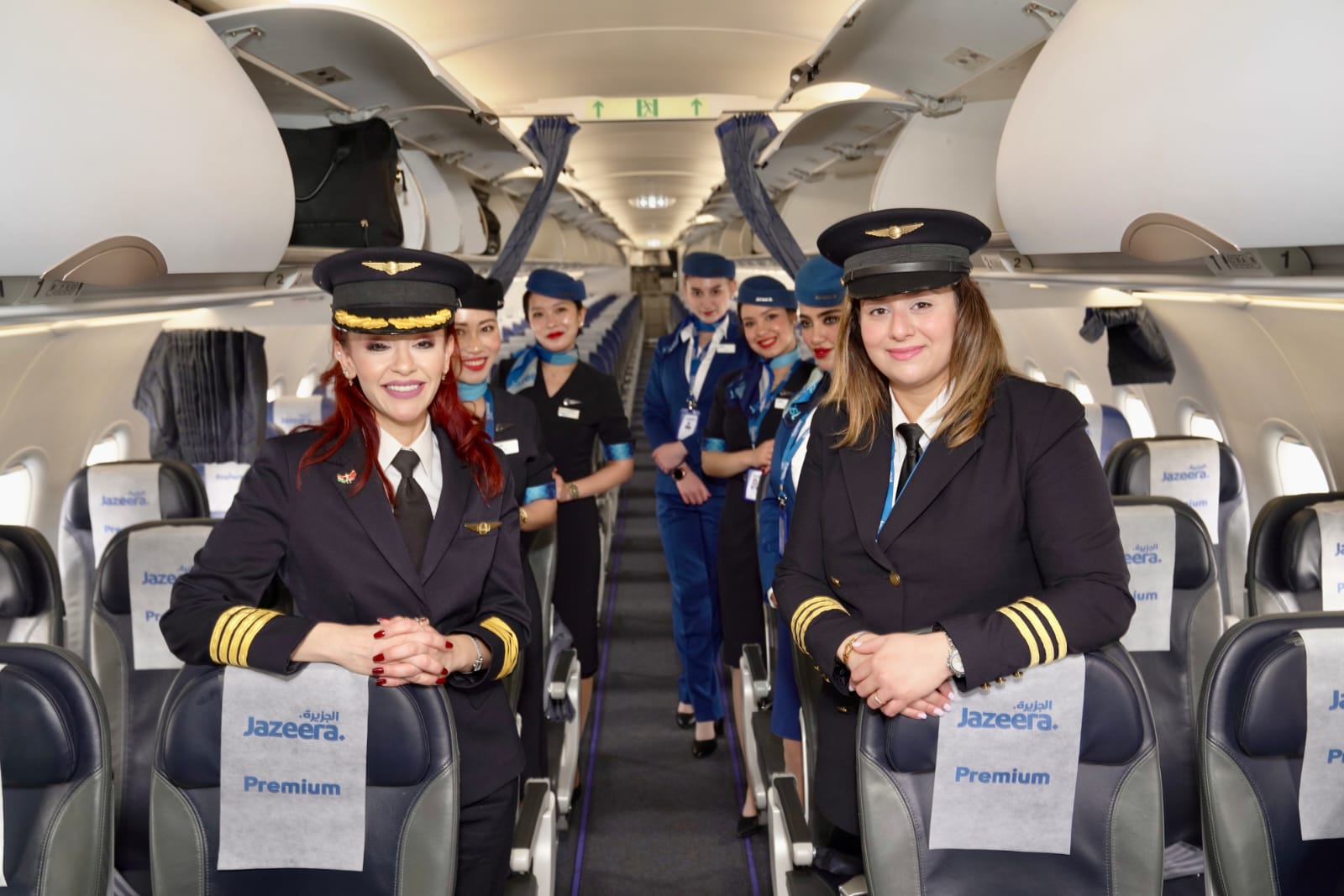 افراد طاقم طائرة شركة طيران الجزيرة النسائي مع الرئيس التنفيذي للشركة روهيت راماشاندران احتفالا باليوم العالمي للمرأة