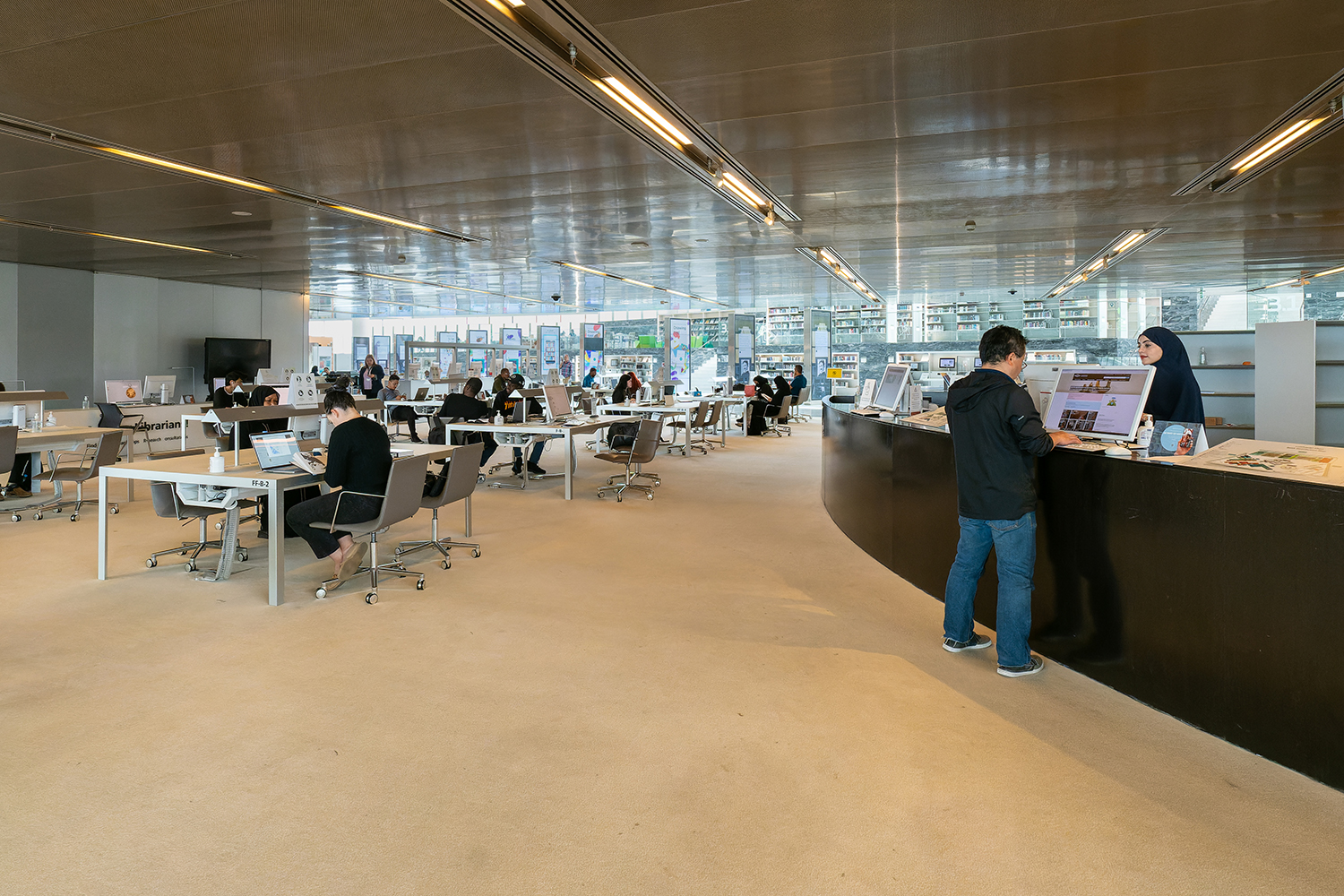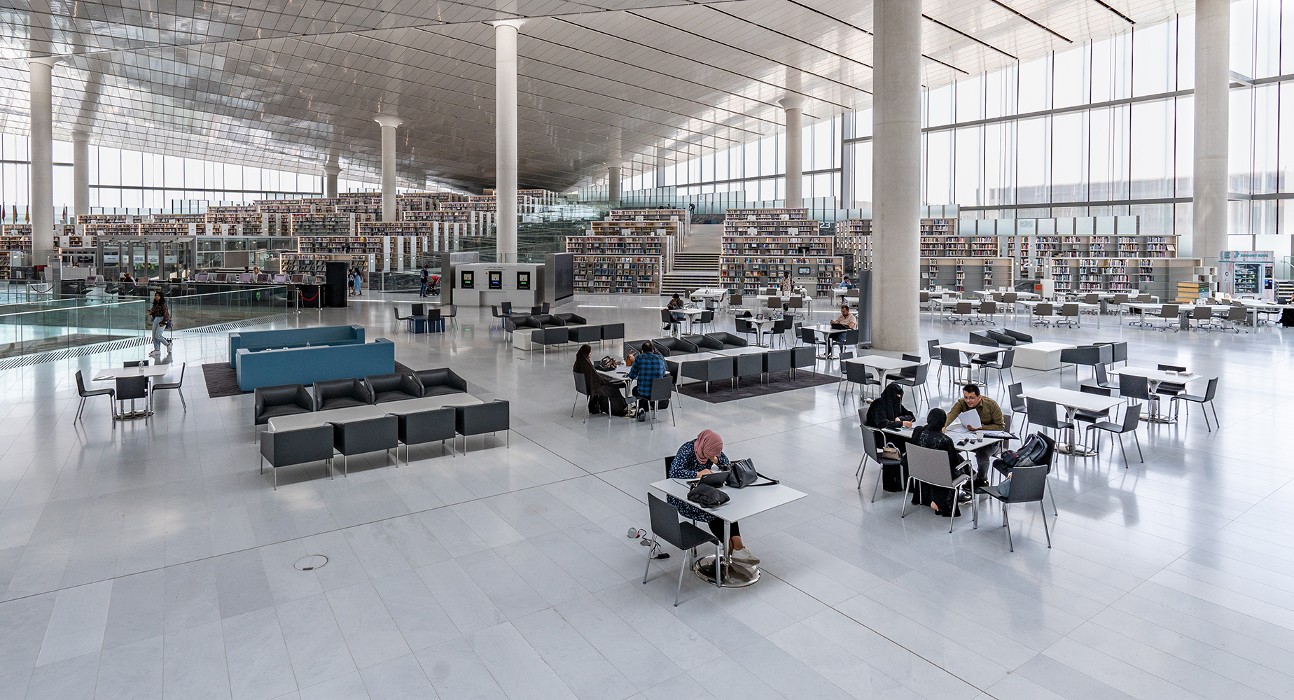Le style architectural de la bibliothèque est moderne et très éclairé, avec des étagères mettant en valeur les livres.