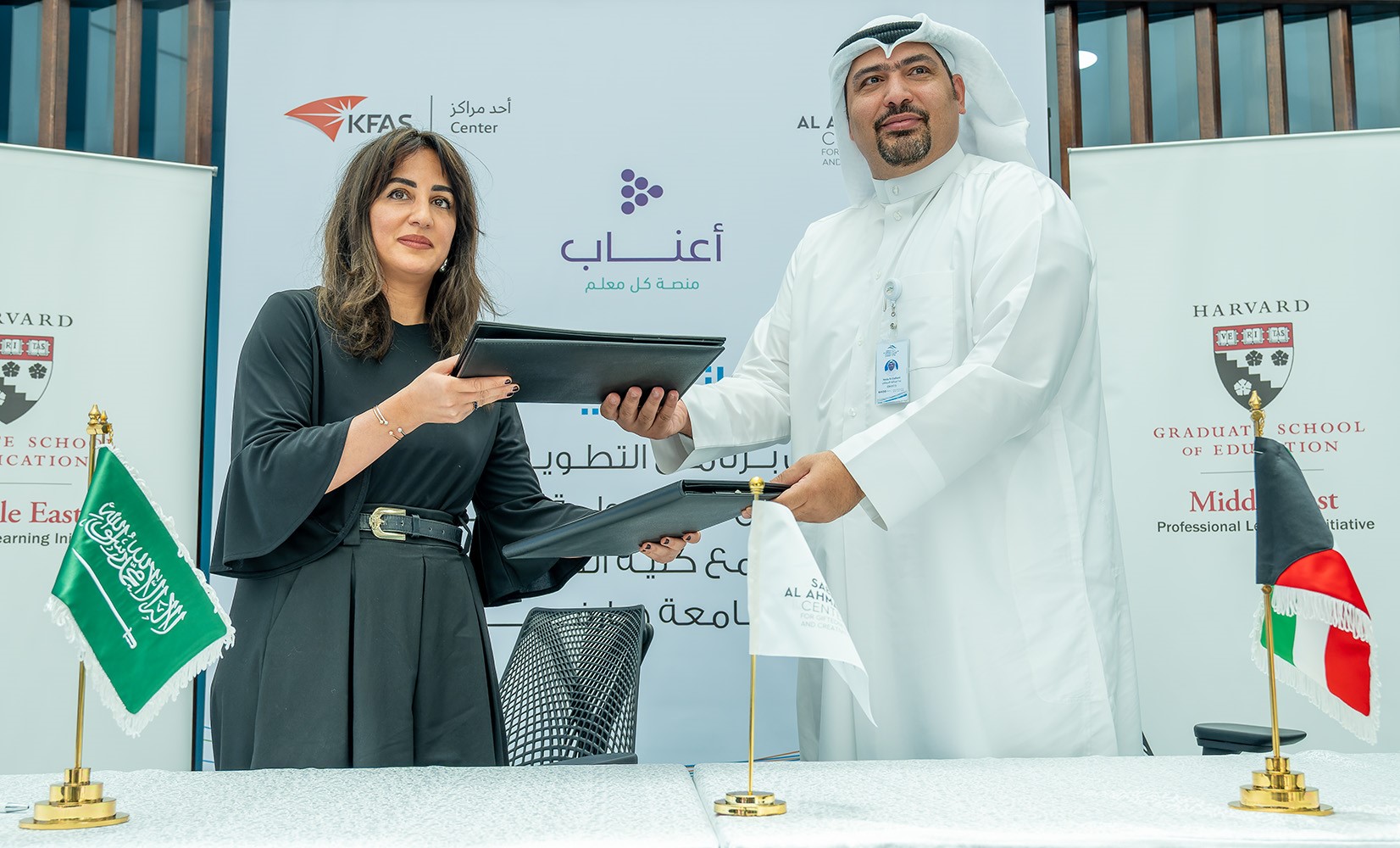 الكويت - 14 - 6 (كونا) -- وقع مركز صباح الأحمد للموهبة والإبداع التابع لمؤسسة الكويت للتقدم العلمي اتفاقية تعاون مع منصة (أعناب) السعودية لإطلاق برنامج التطوير المهني للمعلمين في دولة الكويت بالتعاون مع كلية الدراسات العليا للتعليم في جامعة (هارفارد) الأمريكية.