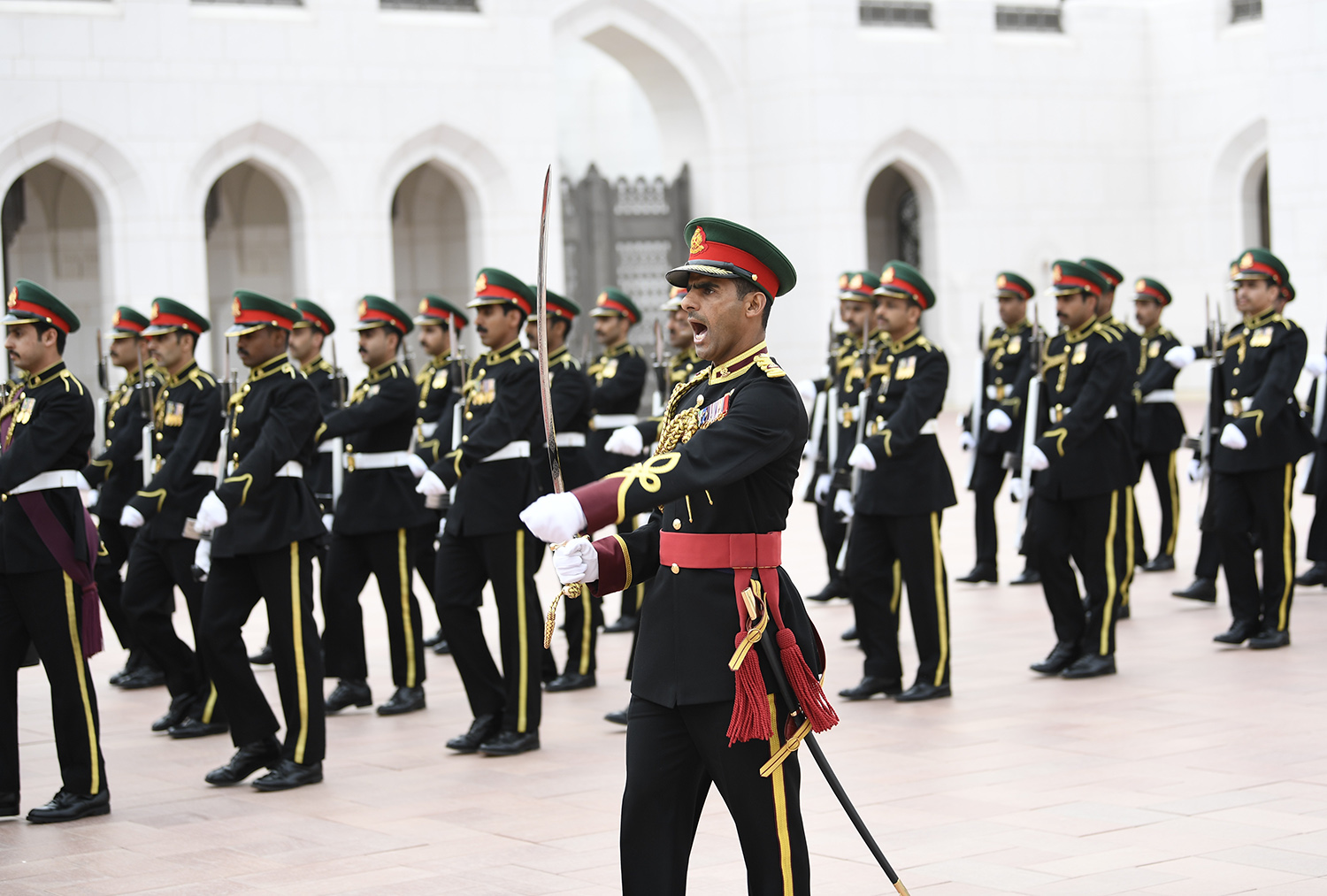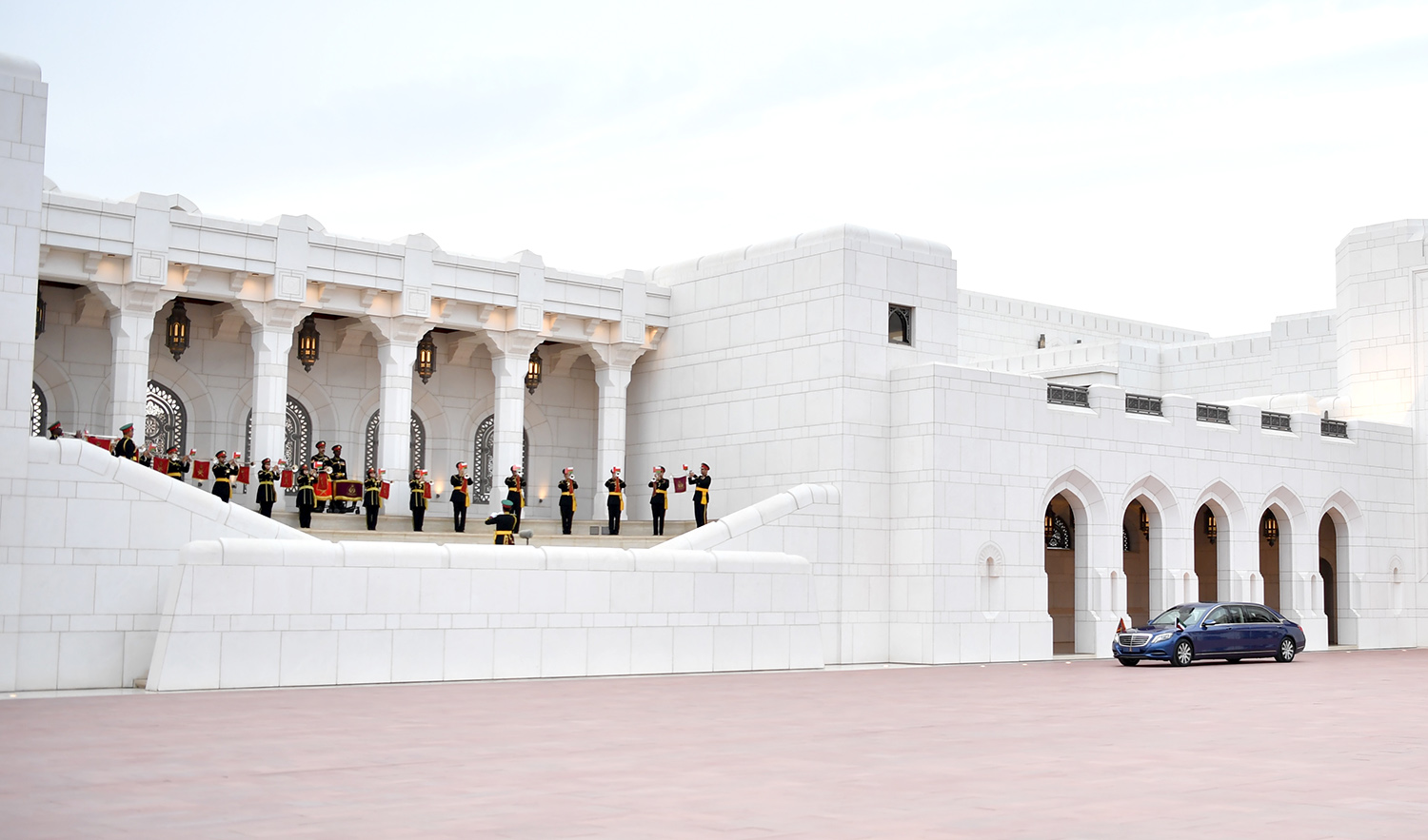 ولدى وصول الموكب الرسمي إلى الساحة الداخلية لقصر العلم أطلقت المدفعية إحدى وعشرين طلقة ترحيبا بقدوم سموه رعاه الله وعزفت موسيقى الحرس السلطاني (المقطوعة المنتظرة) ونفخت الأبواق بعدها اصطحب جلالة السلطان المعظم سموه حفظه الله ورعاه إلى منصة الشرف حيث تم عزف السلام الوطني لدولة الكويت.