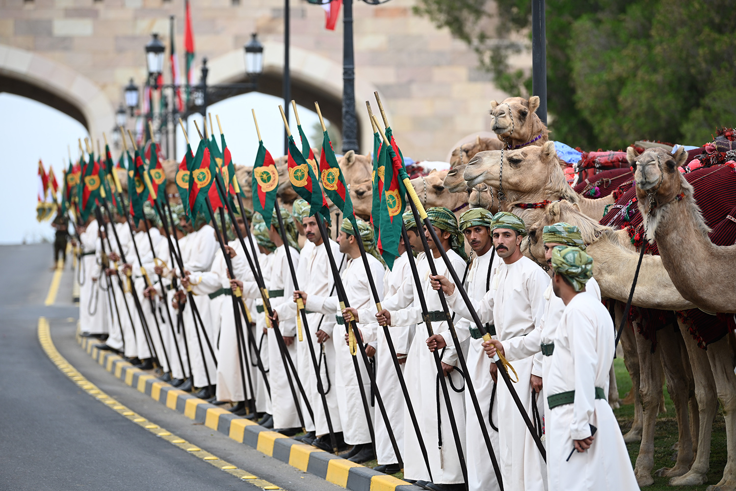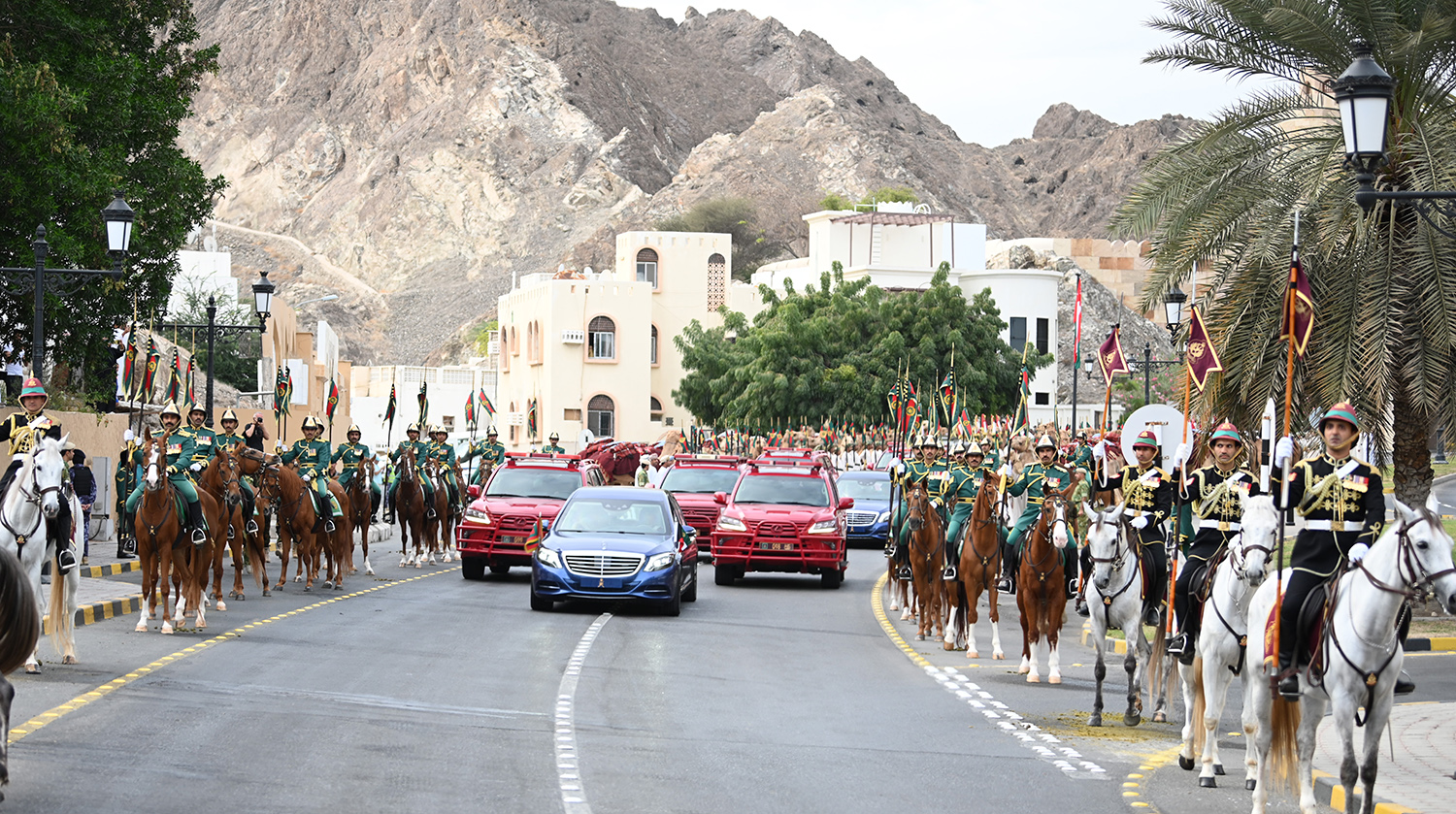 هذا ولدى عبور الموكب الرسمي المقل لحضرة صاحب السمو أمير البلاد حفظه الله ورعاه وأخيه حضرة صاحب الجلالة السلطان هيثم بن طارق المعظم سلطان عمان الشقيقة بوابة مسقط اصطفت على جانبي الطريق مجموعة من الهجانة السلطانية للترحيب بسموه رعاه الله وقد رافق الموكب كوكبة من فرسان الخيالة السلطانية وخيالة الحرس السلطاني بمصاحبة الموسيقى العسكرية الراكبة حتى مبنى المتحف الوطني.