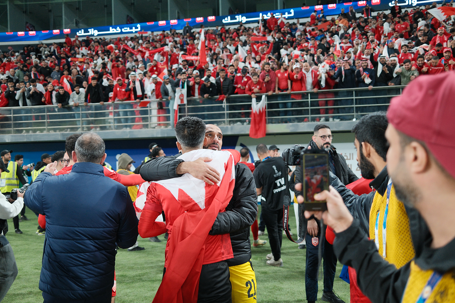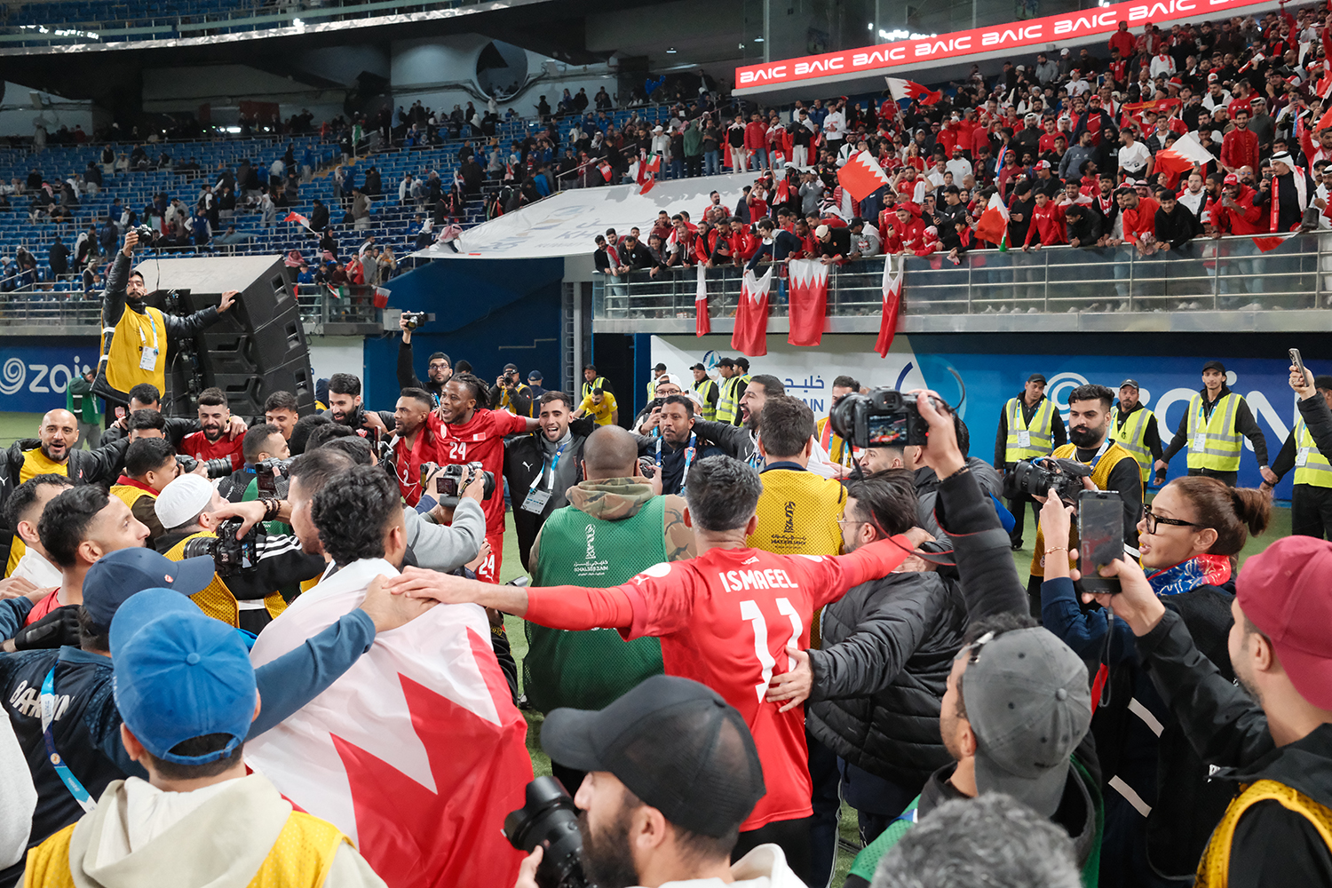 واحتفل اللاعبون في وسط الملعب وهم يحيون جماهيرهم الحاضرة من البحرين لمؤازرتهم. (النهاية)