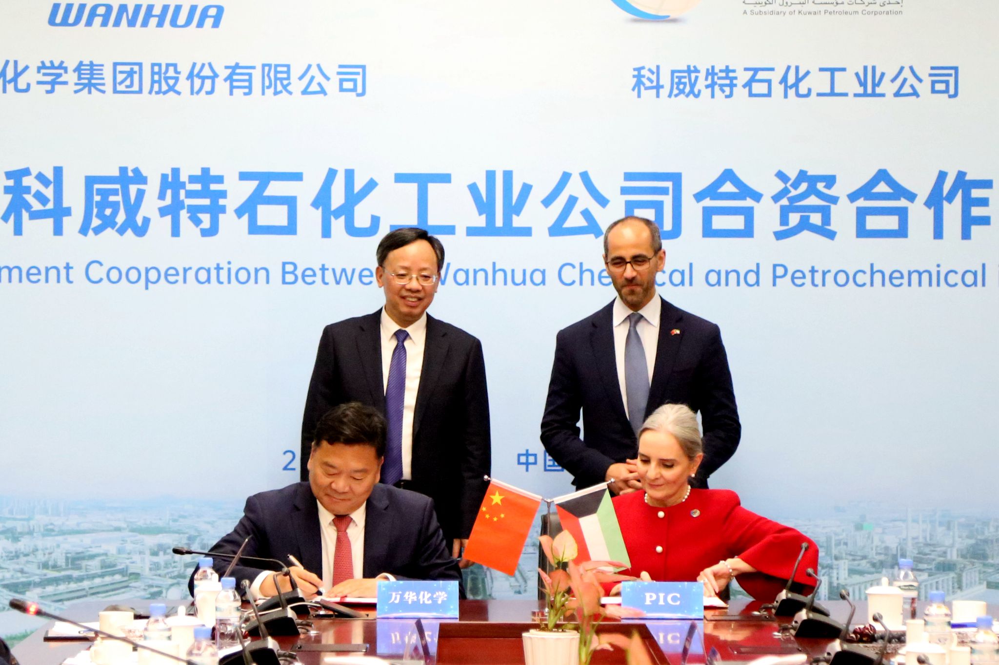 وذكر البيان أن الاتفاقية وقعت رسميا في مدينة يانتاي الصينية من قبل الرئيس التنفيذي لشركة صناعة الكيماويات البترولية نادية الحجي ورئيس شركة (وانهوا كميكال) كو غوانغوو بحضور الشيخ نواف الصباح ولياو زينغتاي.