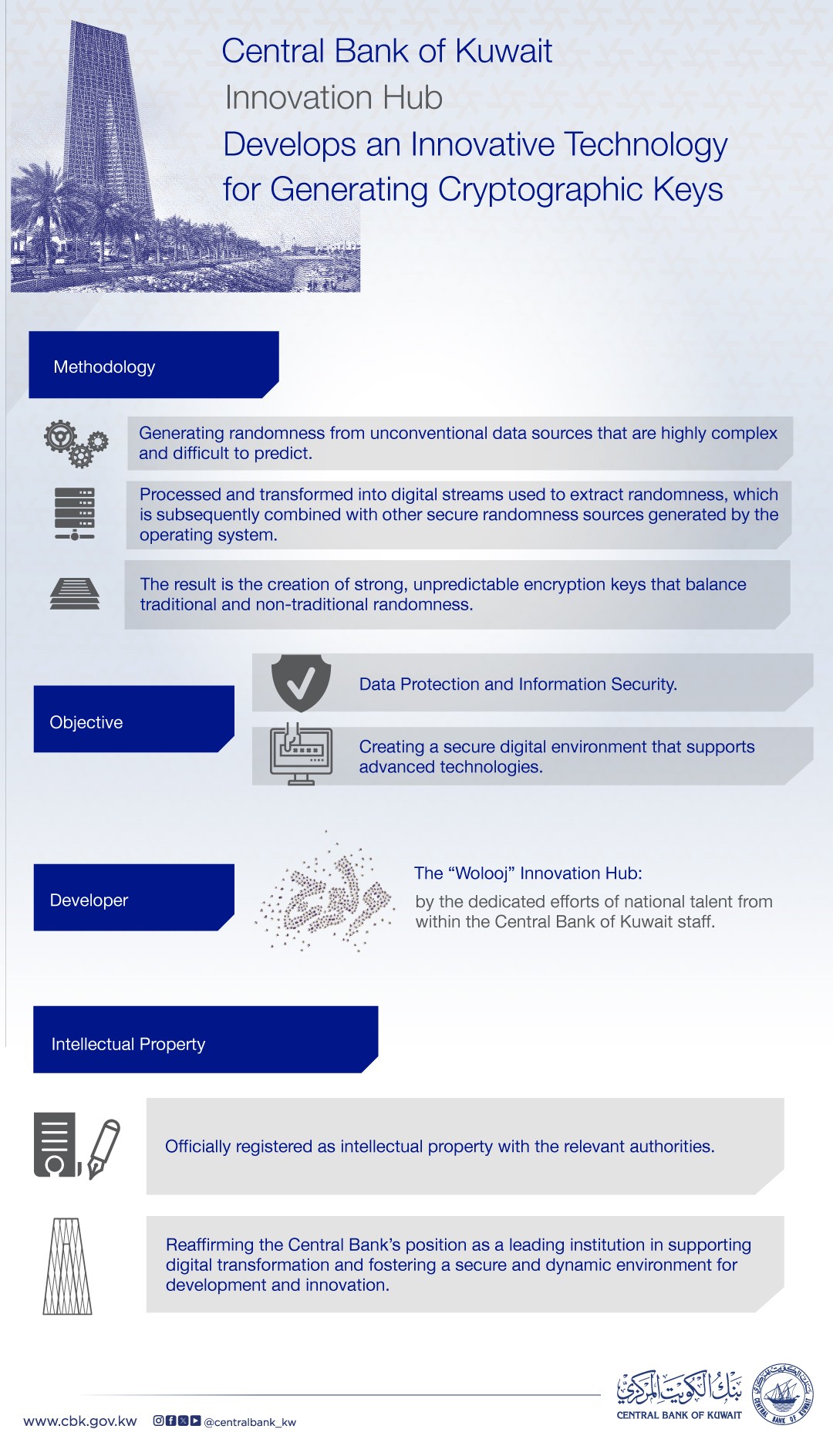 KUWAIT, May 21 (KUNA) -- Governor of the Central Bank of Kuwait Basel Ahmad Al-Haroon announced that the Bank's Innovation Hub "Wolooj" developed an innovative technology for generating cryptographic keys, marking a major leap in data protection and information security.