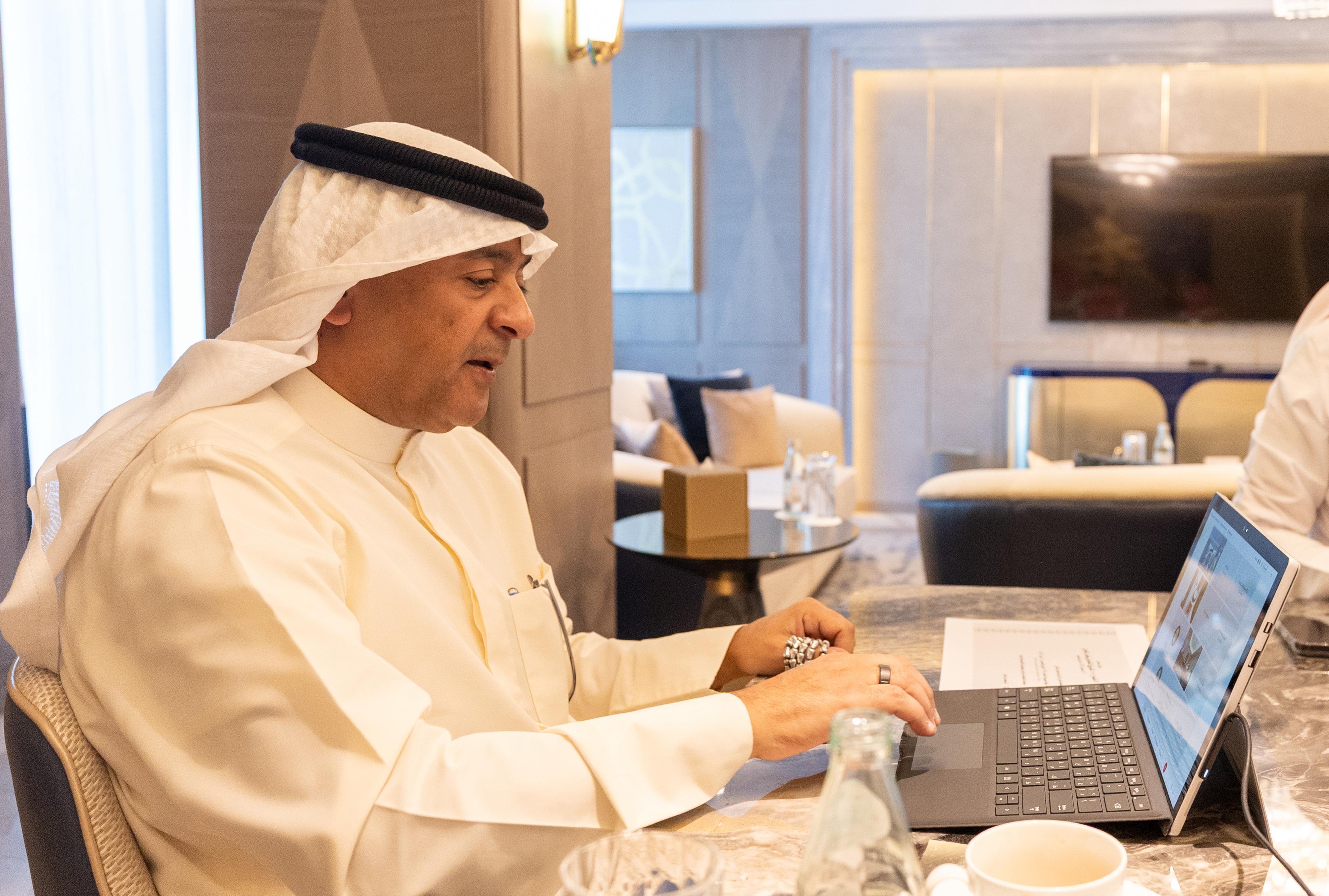 الأمين العام لمجلس التعاون لدول الخليج العربية جاسم البديوي خلال الاجتماع المرئي مع الفريق التفاوضي لمجلس التعاون لاتفاقيات التجارة الحرة