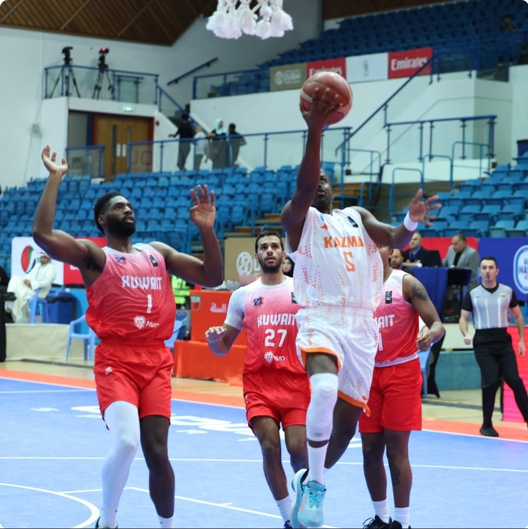 لاعب نادي الكويت يفرض سيطرته تحت السلة خلال مواجهة الفريقين