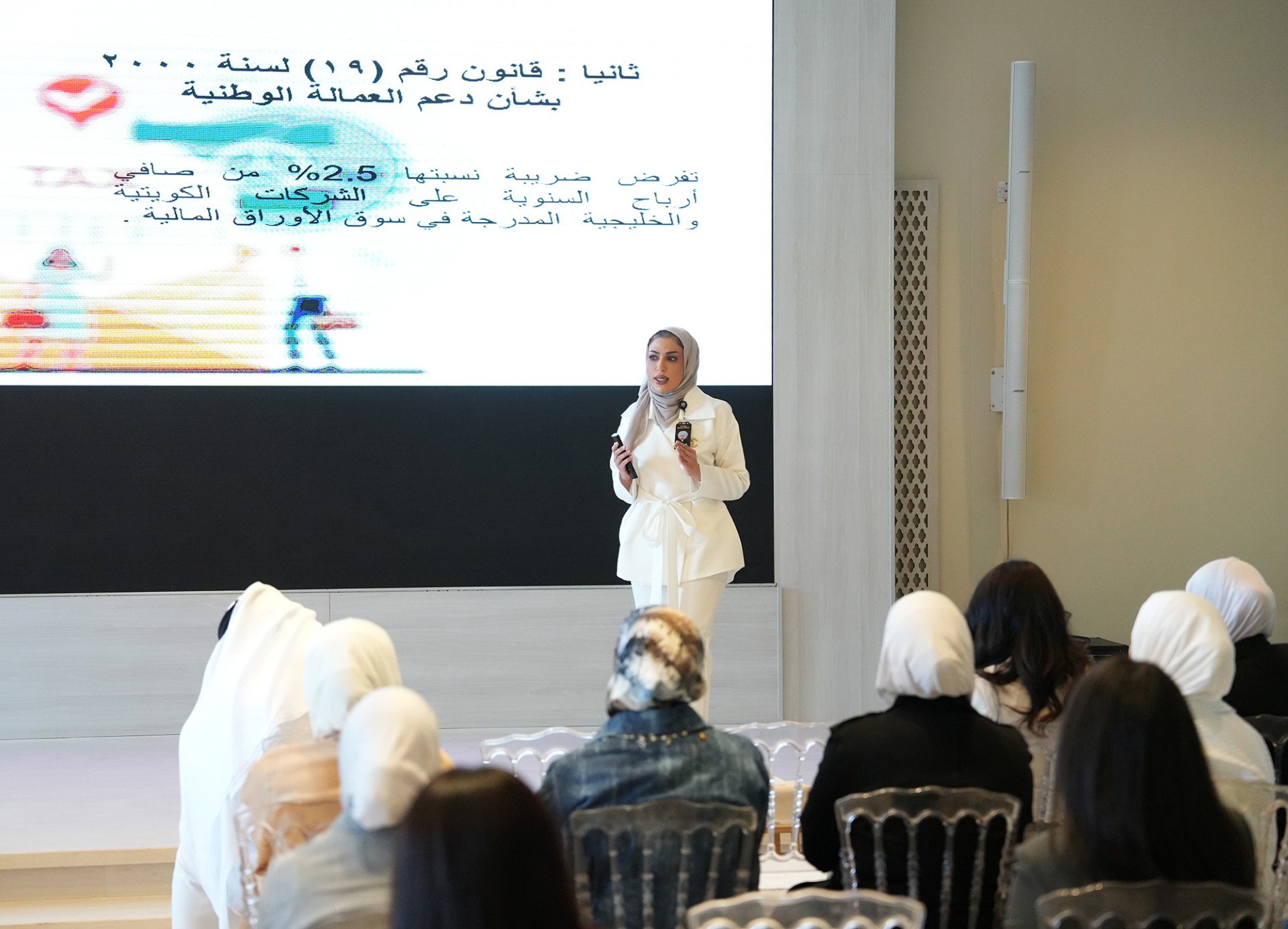 وتطرقت المحاضرة إلى أنواع الضريبية والفرق بين الضريبة والرسوم مبينة أن قانون رقم (19) 2000 بشأن دعم العمالة الوطنية يفرض ضريبة على الشركات المدرجة الكويتية والخليجية المدرجة في سوق الكويت للاوراق المالية بنسبة 5ر2 في المئة.