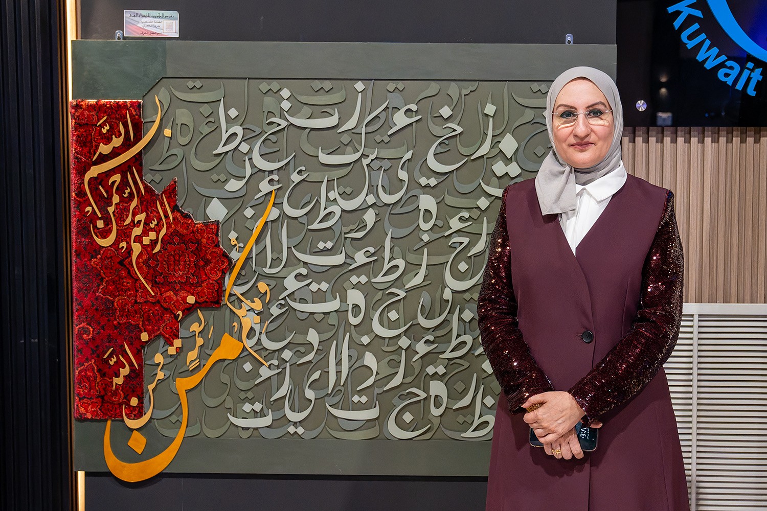 وأضافت الكندري أنها تشارك في المعرض بلوحة تجمع بين الحروف الخشبية الملونة بألوان الأكريليك وقطعة من السجادة المدمجة مع آية قرآنية في عمل يعكس اتجاهها الفني الذي يمزج بين الحرف اليدوي والروح التراثية.