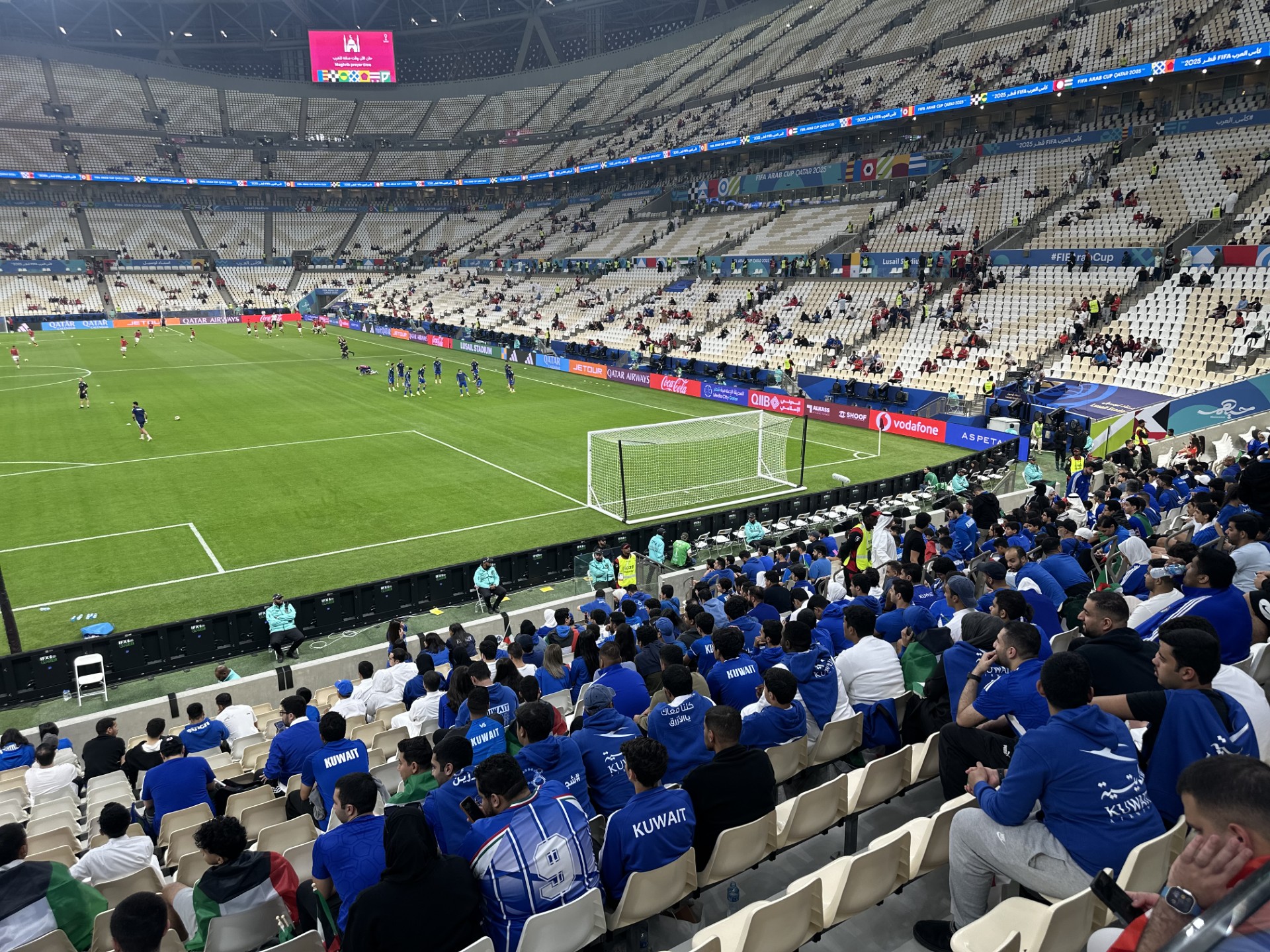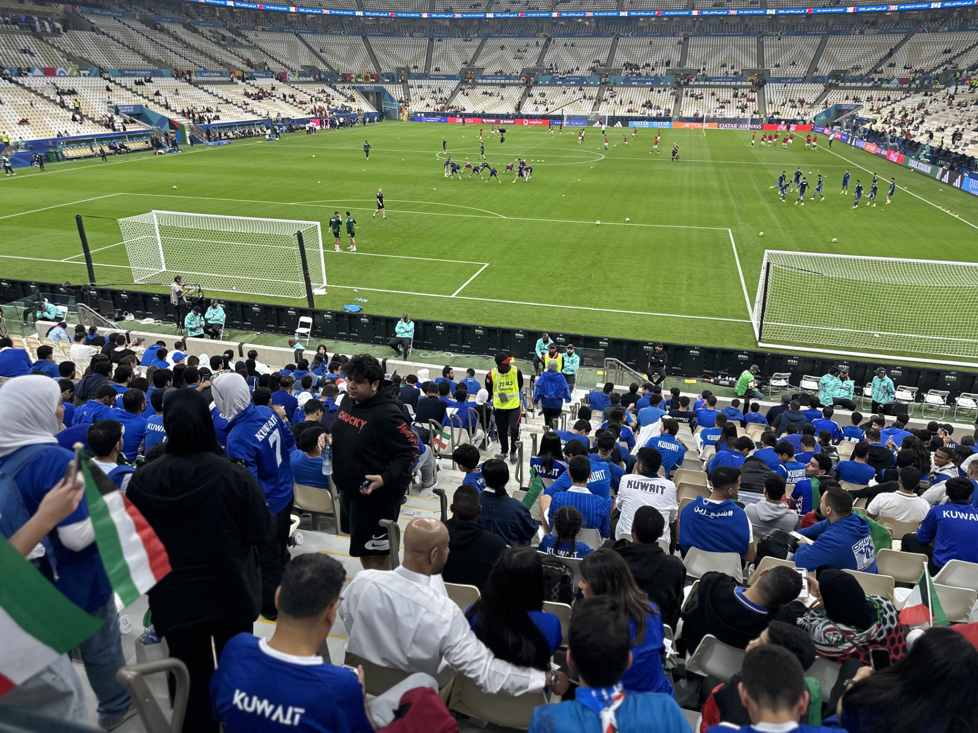 وارتدت الجماهير الكويتية زي المنتخب الوطني دعما ومساندة للأزرق فيما أشعلت الأهازيج الكروية الوطنية أجواء مفعمة بالحماسة.(النهاية)