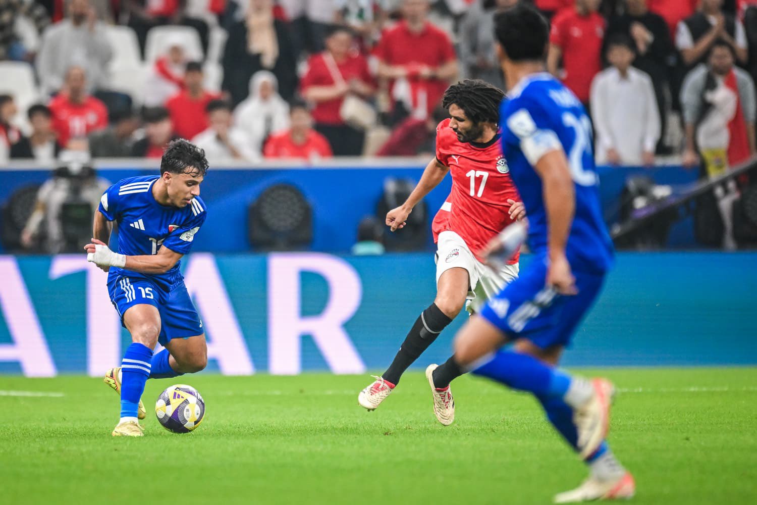 وعلى استاد (لوسيل) المونديالي شهد الشوط الاول سيطرة مصرية على اغلب مجريات اللعب قابله تنظيم دفاعي محكم من قبل الكويت اعتمد من خلاله على الهجمات المرتدة التي كادت أن تثمر لولا سوء الحظ.